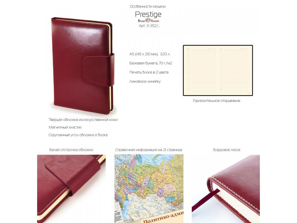 Недатированный ежедневник Prestige от бренда Bruno Visconti - это качественный корпоративный подарок по выгодной цене, произведенный специально под персонализацию. Представлен в универсальном формате А5 и содержит 320 страниц. Не лишенный солидности и респектабельности новый ежедневник Prestige от Bruno Visconti идеально дополняет имидж современных профессионалов. Твердая обложка выполнена из гладкого кожзама, неотличимого от кожи fiore vegetale. Скругленный корешок и уголки обложки в сочетании с магнитным клапаном делают ежедневник Prestige невероятно стильным аксессуаром. Глянцевая поверхность материала акцентирована контрастной белой строчкой вдоль закругленного края. Функциональная деталь - широкий магнитный клапан. Декоративный хлястик надежно фиксирует блок, исключая случайное раскрывание в сумке.