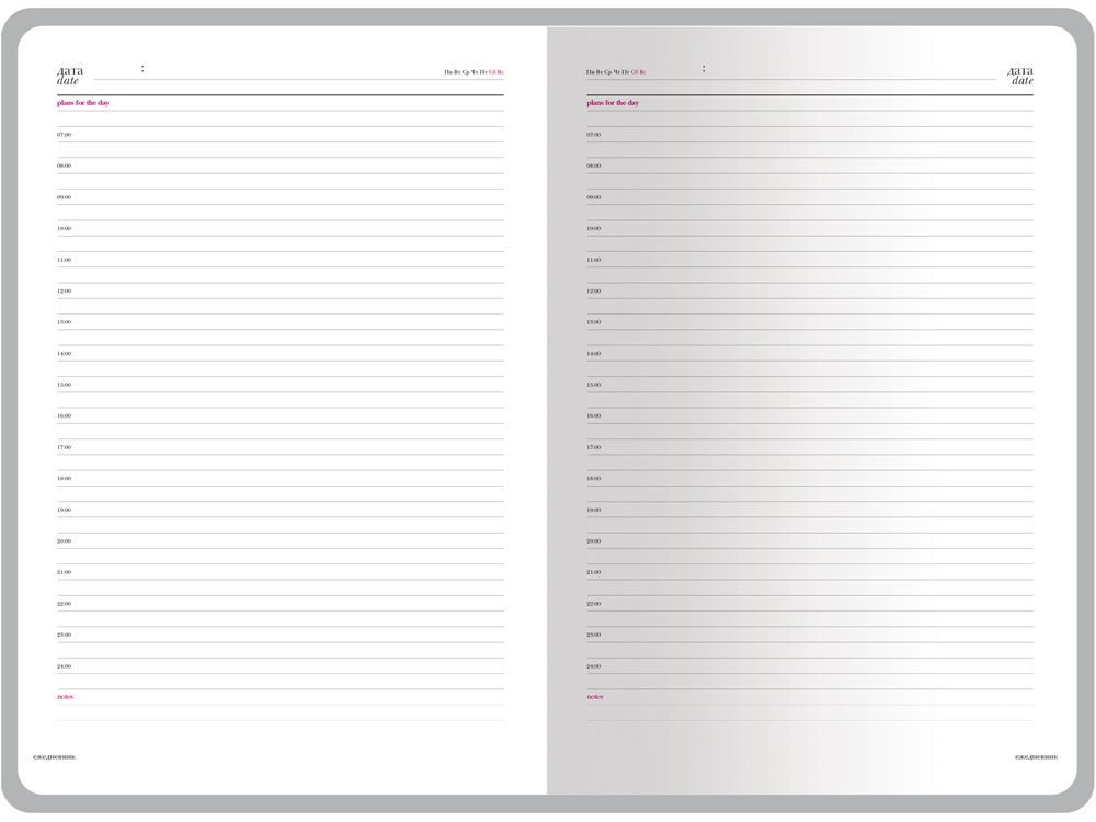 В ежедневнике Sidney Nebraska есть полезная справочная информация и телефонная книга на 18 листов, а также 272 страницы для записи идей, мыслей и составления рабочих планов. Для изготовления страниц используется качественный бежевый офсет повышенной плотности (70 г/кв м), который производится в Японии и подходит для всех видов чернил. Разметка блока с указанием времени позволяет планировать дела с точностью до 1 часа.