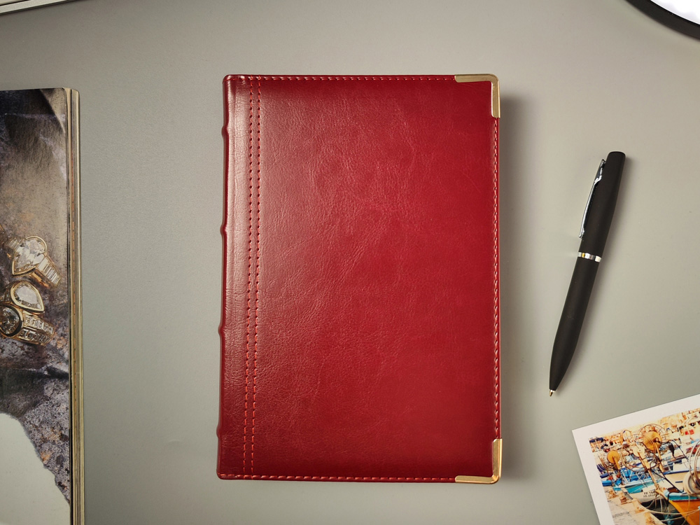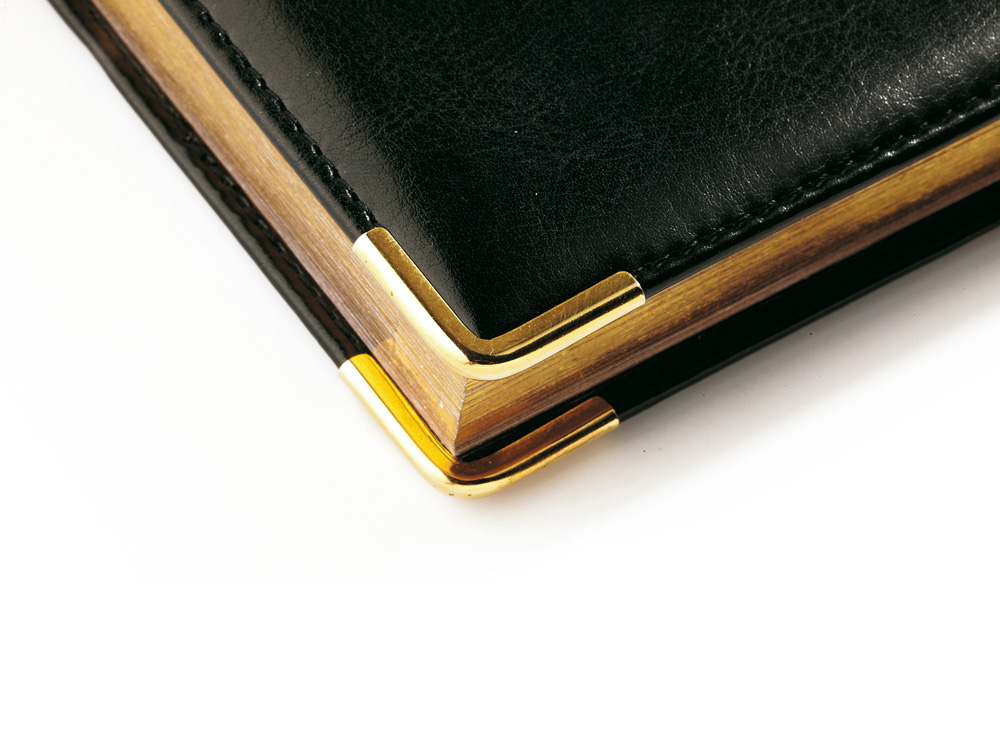 Классический деловой ежедневник линии Boss – образец элегантности. Гладкую тонкую фактуру экокожи подчеркивает декоративная строчка по контуру и металлические закругленные уголки золотистого цвета.