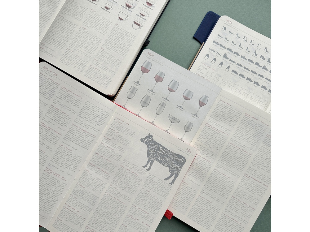 Бумажный блок, закрепленный книжным переплетом, выполнен из бежевой офсетной бумаги плотностью 70 г/кв.м и содержит 272 страницы, из которых 17 страниц - справочная информация, а 19 страниц телефонная книга.