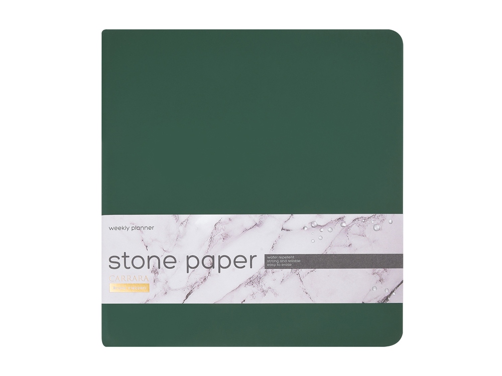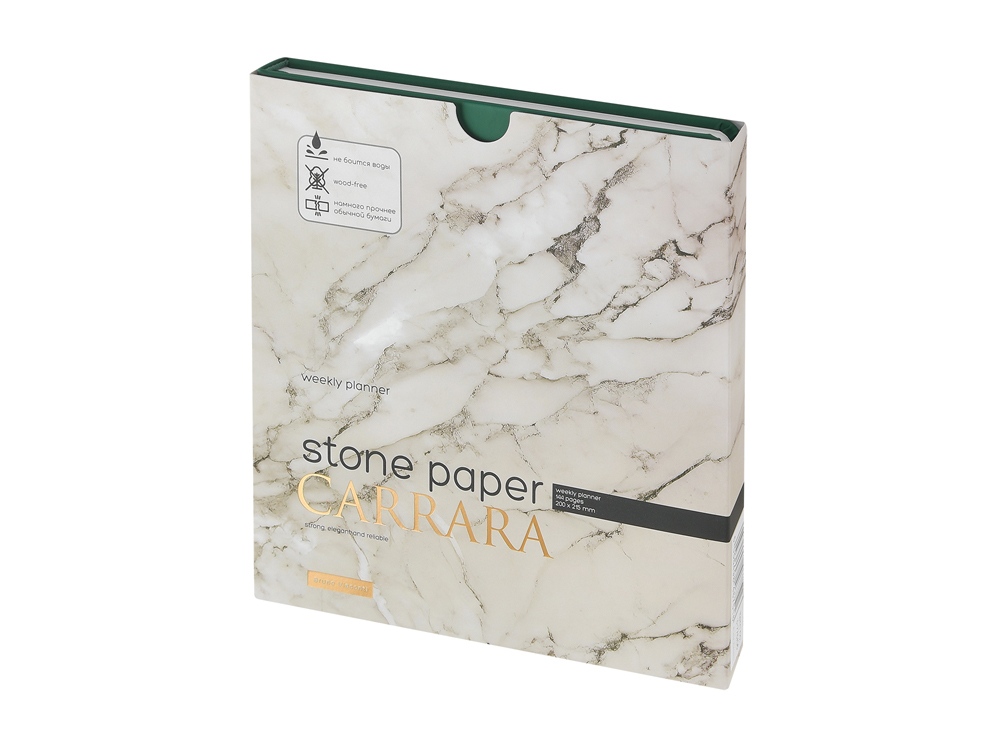 Блок произведен из каменной бумаги плотностью 144 г/кв.м, отличающейся особой гладкостью и повышенной прочностью. Она не боится воды и пролитого кофе, достаточно просто протереть сухой салфеткой.