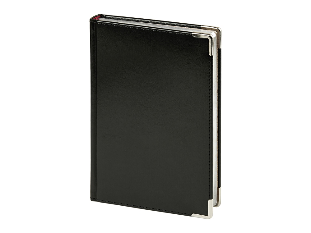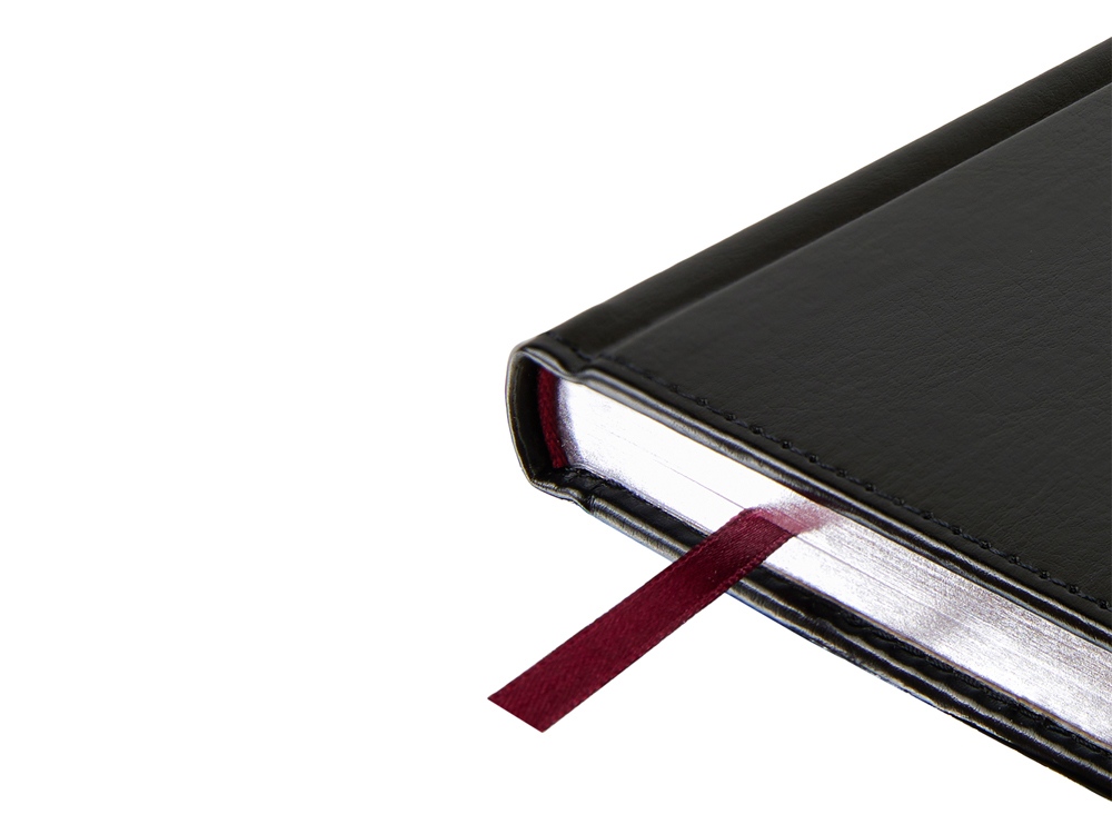 Благородство и статусность придают ежедневнику отстрочка по периметру в тон, скругленные углы, закладка-ляссе бордового цвета, серебряный обрез и металлические уголки.