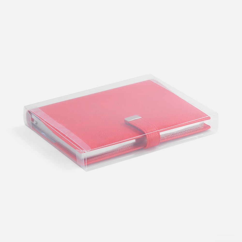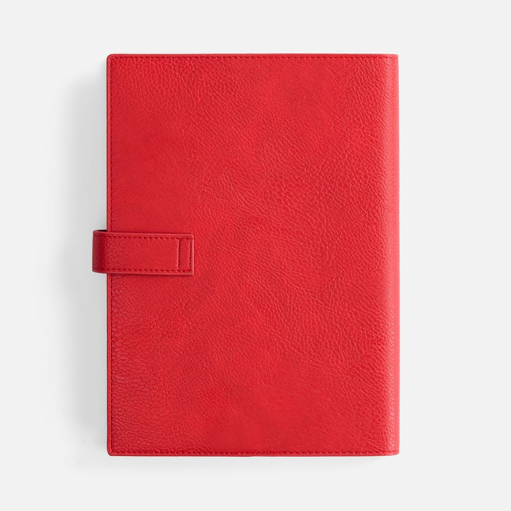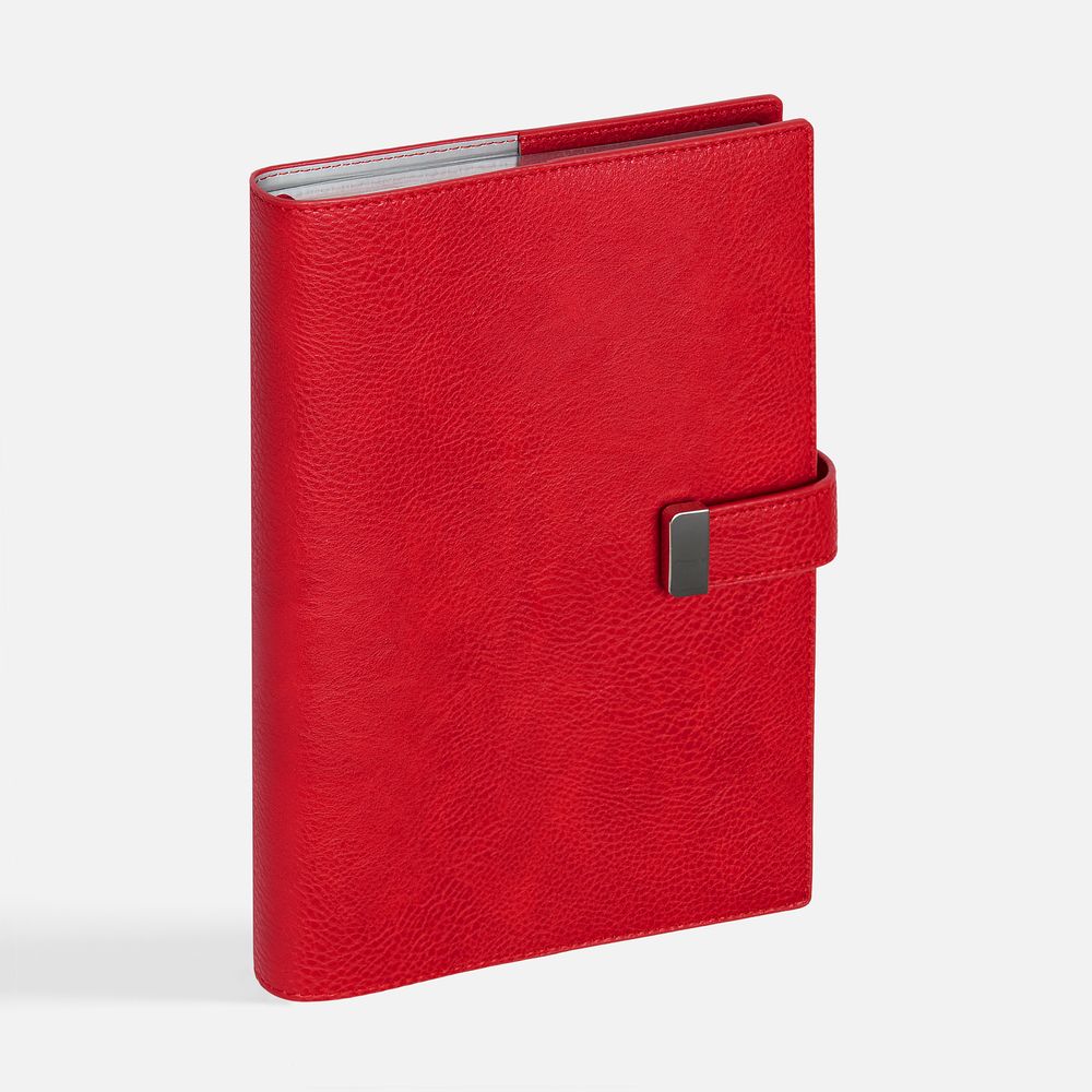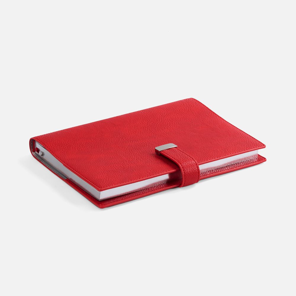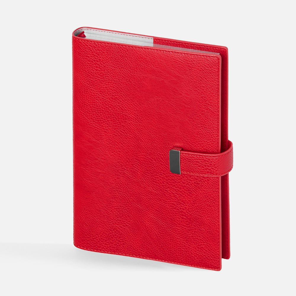 Ежедневник в мягком переплете со съемной обложкой, дополнен застежкой-хлястиком с металлическим шильдом на кнопке, двойным ляссе и капталом.