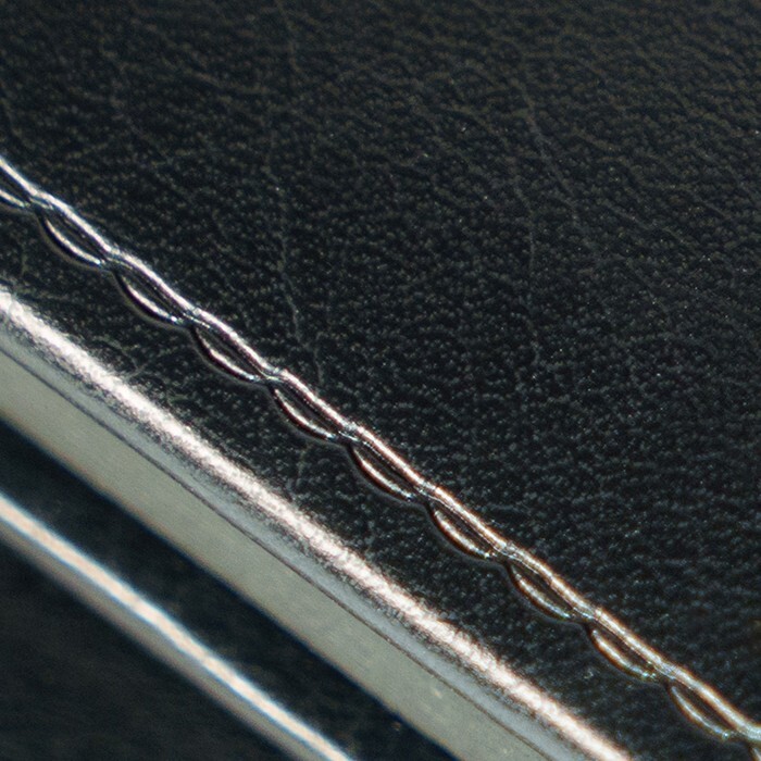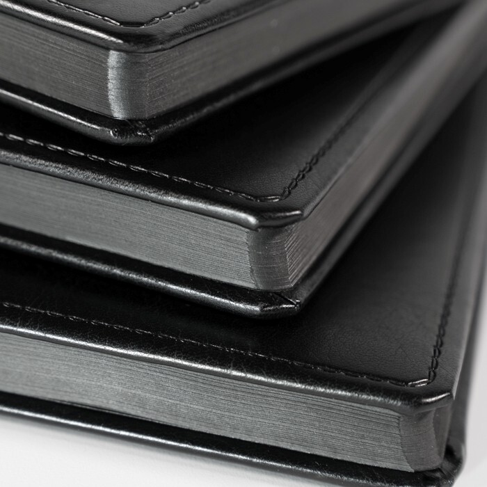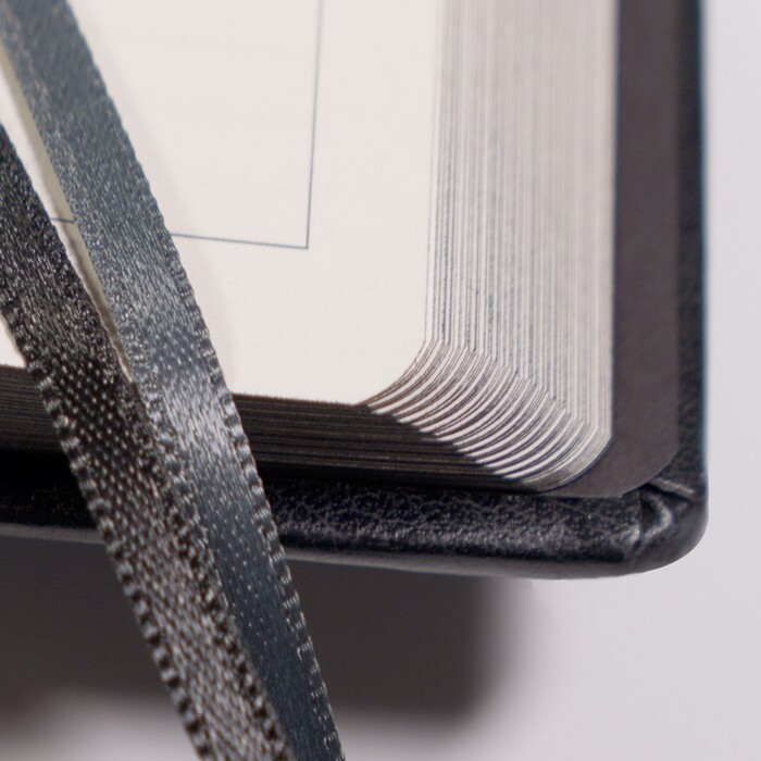 Форзацы из черной дизайнерской бумаги FSC. Двойное ляссе. Жесткая обложка Sherwood черного цвета с круглыми уголками из премиального кожзама от ведущего итальянского производителя. Черный срез блока с круглыми уголками. Ежедневник-еженедельник Week & Day выгодно выделяется на фоне стандартных форматов своим эксклюзивным дизайном и функциональностью.