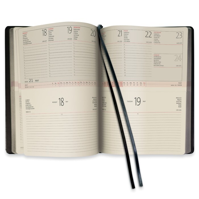 Week & Day является уникальным с точки зрения технологического исполнения изданием. Оригинальный дизайн совмещает в себе функции ежедневника и еженедельника за счет нестандартно разделенного на две части блока: на одной половине блока разворот еженедельника, а на второй – ежедневник с двумя дополнительными листами – решение, которое дает возможность видеть текущую неделю на развороте и одновременно пролистывать каждый отдельный день этой же недели постранично. Международный блок на 6 языках, в том числе на казахском и русском языках. формат 17 х 24 см. Блок 344 стр. печать в два цвета, тонированная бумага FSC