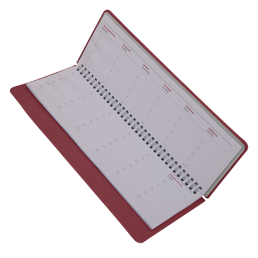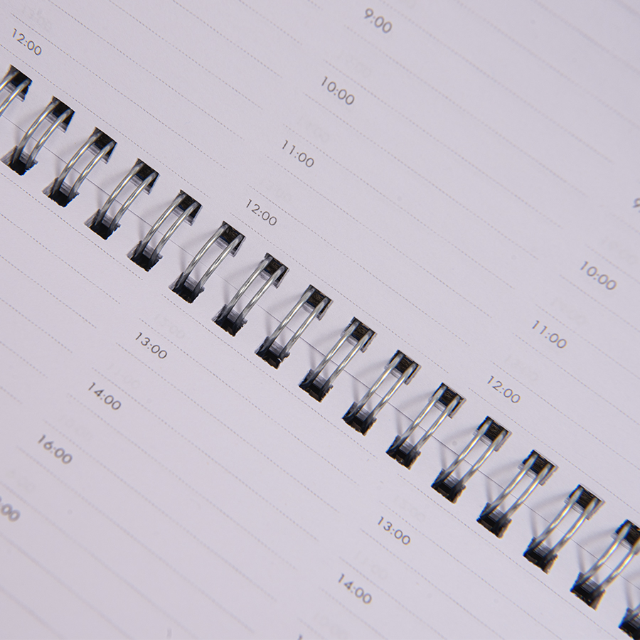 Переплет твердый, на металлической спирали, прошивка по периметру верхней обложки