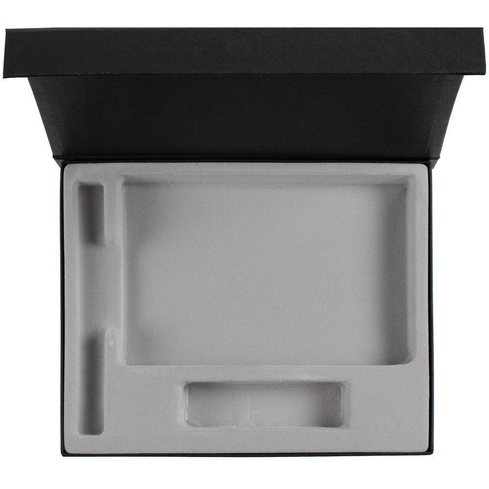 Коробка из переплетного картона, кашированного гладкой дизайнерской бумагой Magic, с крышкой на магните и флокированным ложементом.