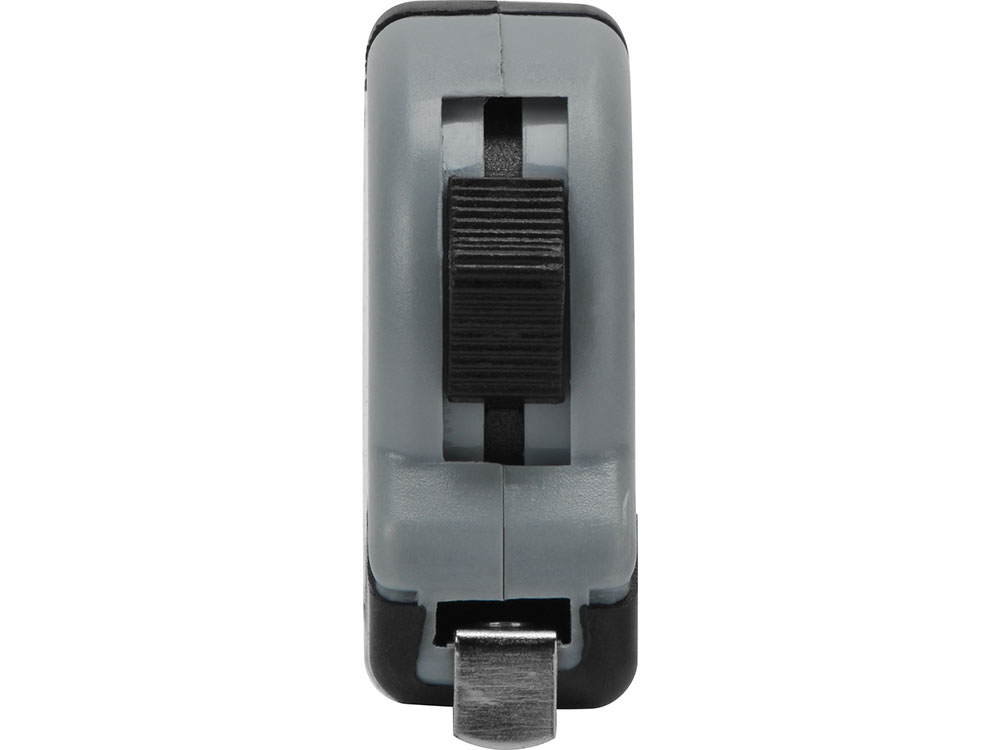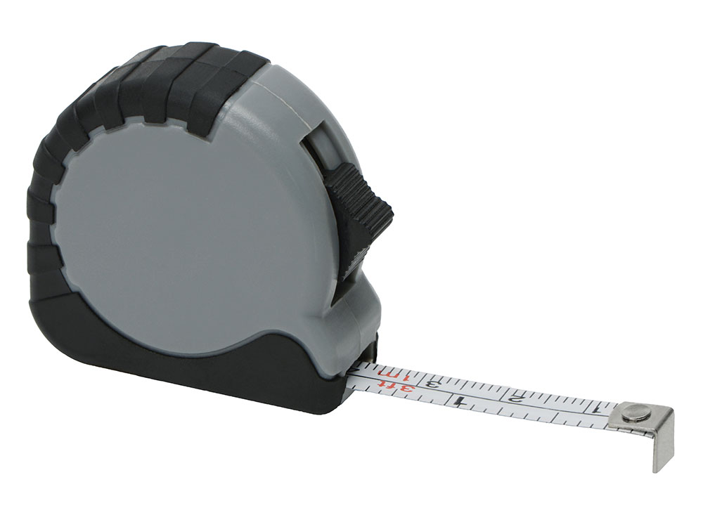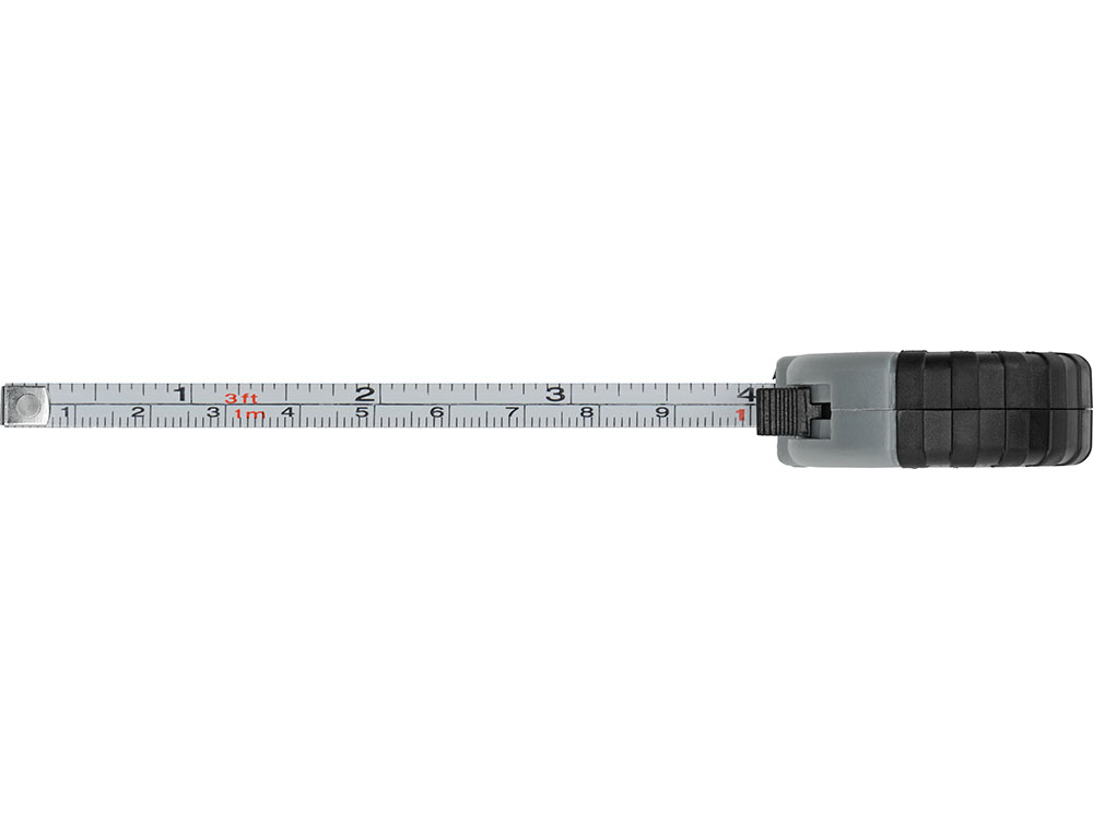 Рулетка длиной 1 м с возвратной пружиной и стопором со шкалой в сантиметрах и дюймах. Кнопка для фиксации ленты.