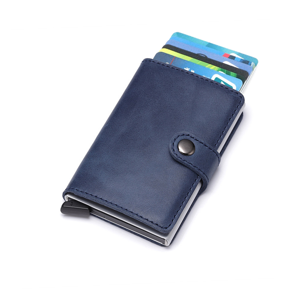 Солидный практичный держатель для банковских карт Bakara с покрытием из экокожи книжного типа и возможностью закрывать, а также функцией RFID, чтобы защитить карты он несанкционированного копирования. Имеет нижнюю кнопку для быстрого извлечения карт.
