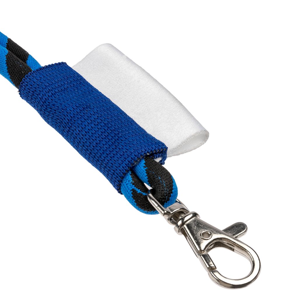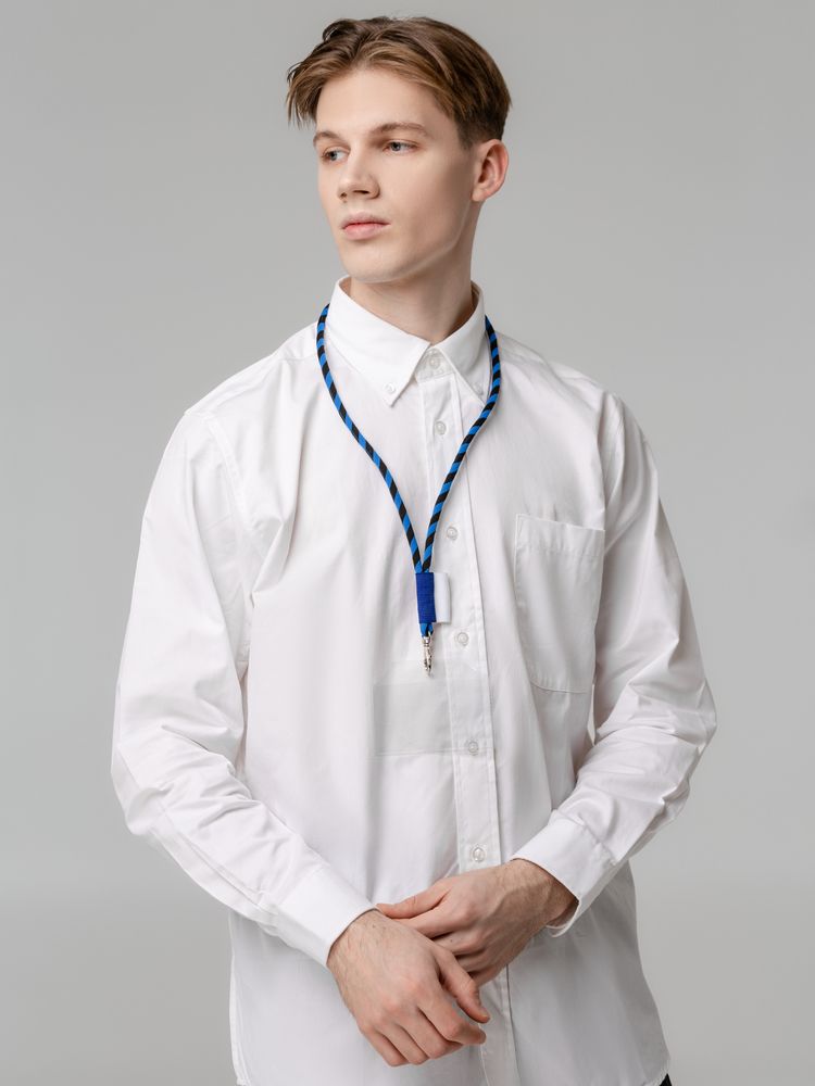 Шнурок дополнен резинкой с биркой под печать и металлическим карабином.