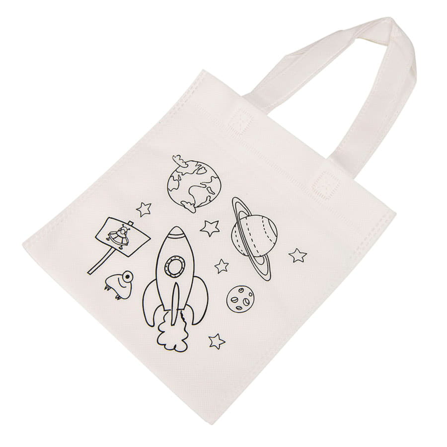 Сумка из нетканого материала белого цвета, специально разработанный для раскрашивания мелками. В набор входят 5 цветных мелков: синий, красный, желтый, зеленый, черный.