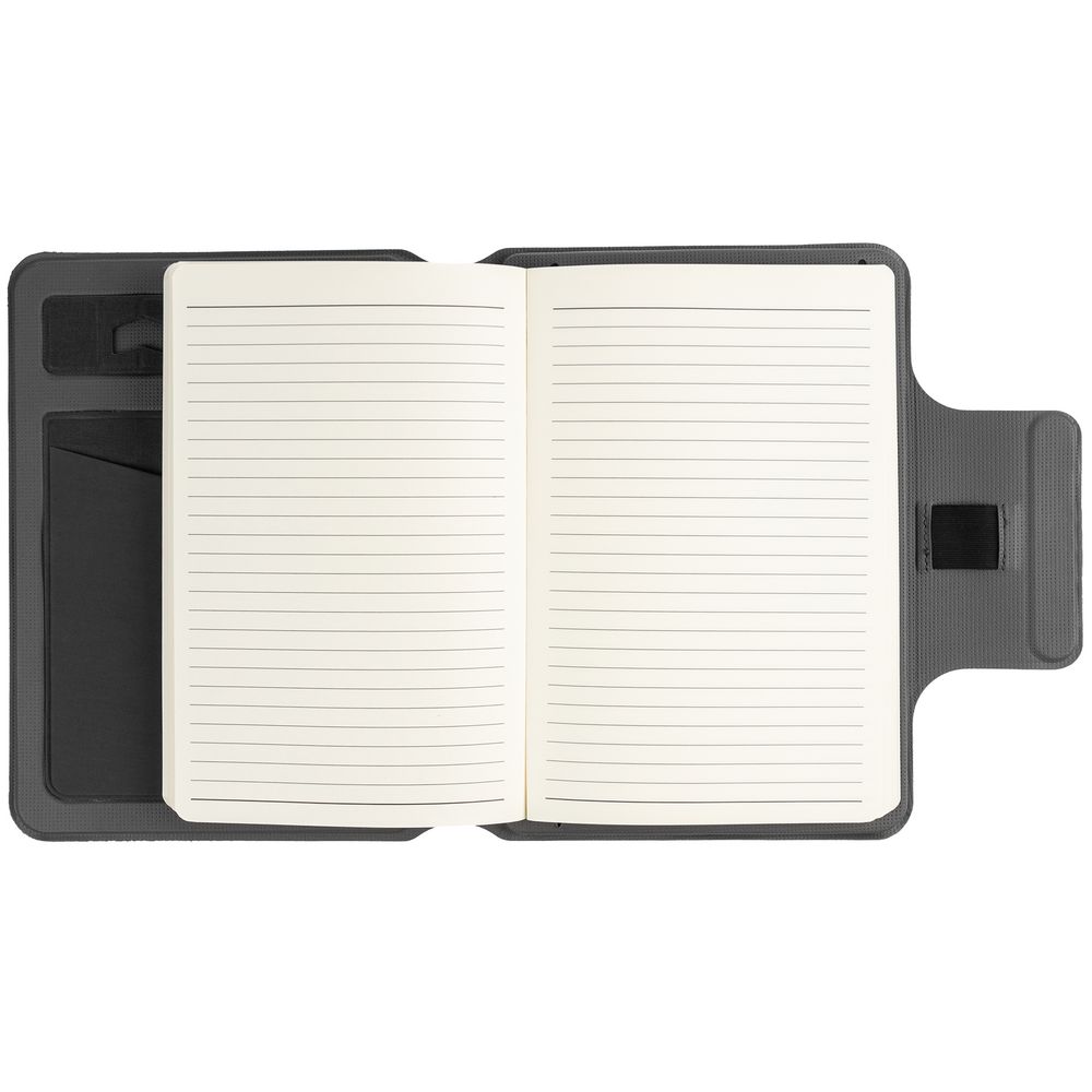 Органайзер с блокнотом и аккумулятором с беспроводной зарядкой. Обложка с фактурой, имитирующей ткань, на магнитной застежке.