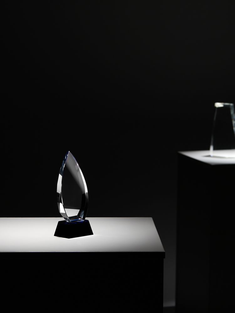 Стела изготовлена из стекла К9, в основе которого лежит оптическое боросиликатное стекло. Эту марку стекла отличает низкий процент посторонних включений, высокий показатель преломления и высокая прозрачность — идеальные качества для изготовления наград премиального уровня.