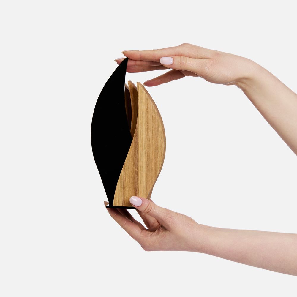 Благородный ясень, символизирующий непобедимость, контрастирует с глянцевой акриловой вставкой — получается эффектное и запоминающееся сочетание. Пусть эта награда зажжет искру вдохновения и поддержит огонь успеха коллег, партнеров и друзей.