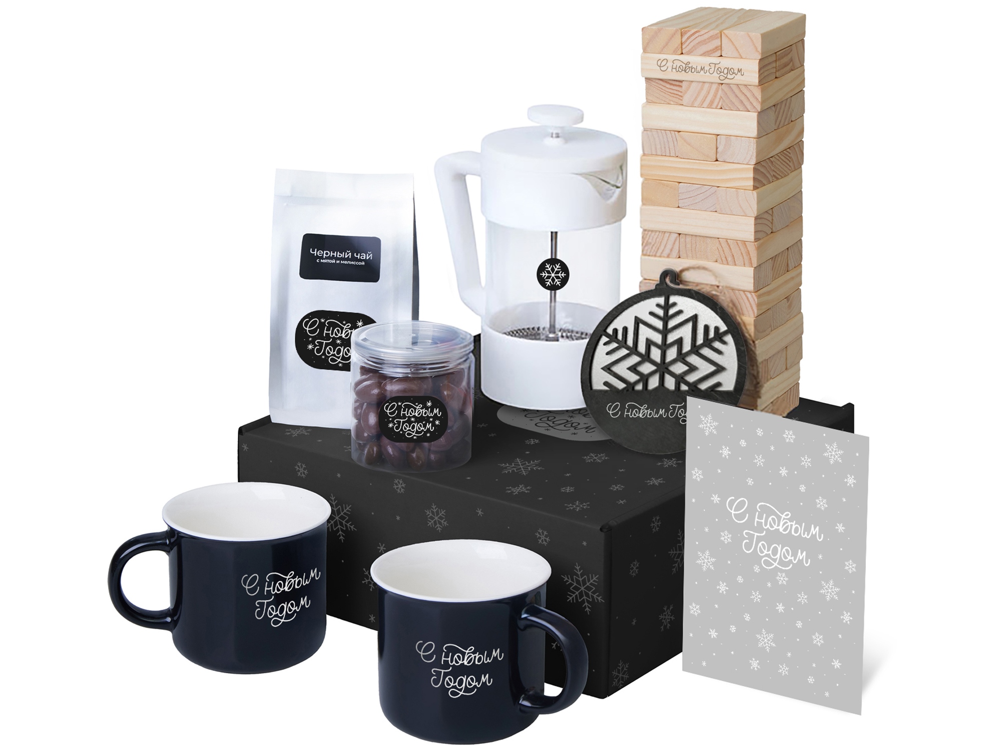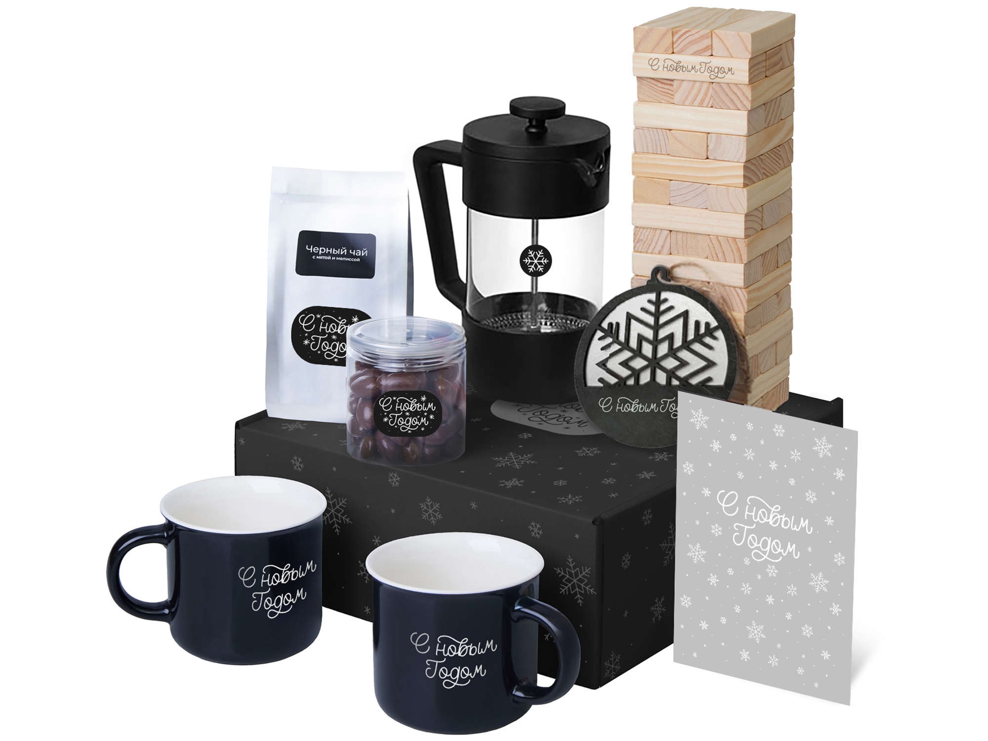 нетканый материал, кружка - костяной фарфор, френч-пресс - боросиликатное стекло, нержавеющая сталь, пластик, игра - дерево сосны, хлопок, подвеска - дерево, открытка - бумага, мешок - нетканый материал (спанбонд)