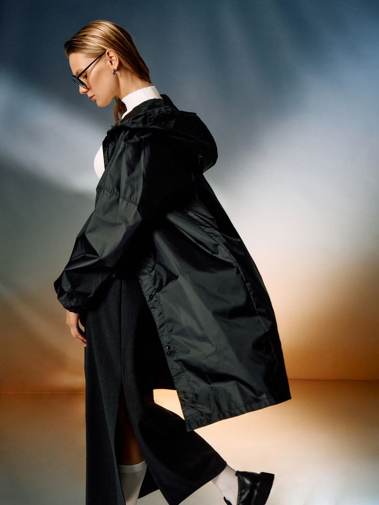 Плащ-дождевик из ткани таффета на кнопках с капюшоном.