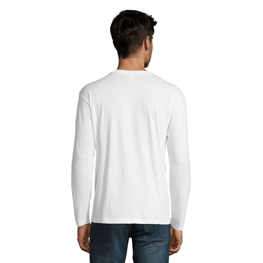 Мужская футболка известного бренда Sols в стиле унисекс с круглым классическим вырезом и длинными прямыми рукавами без резинок.