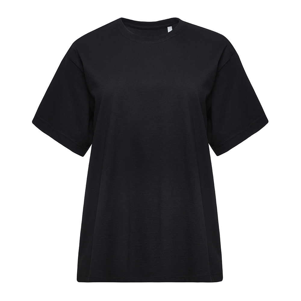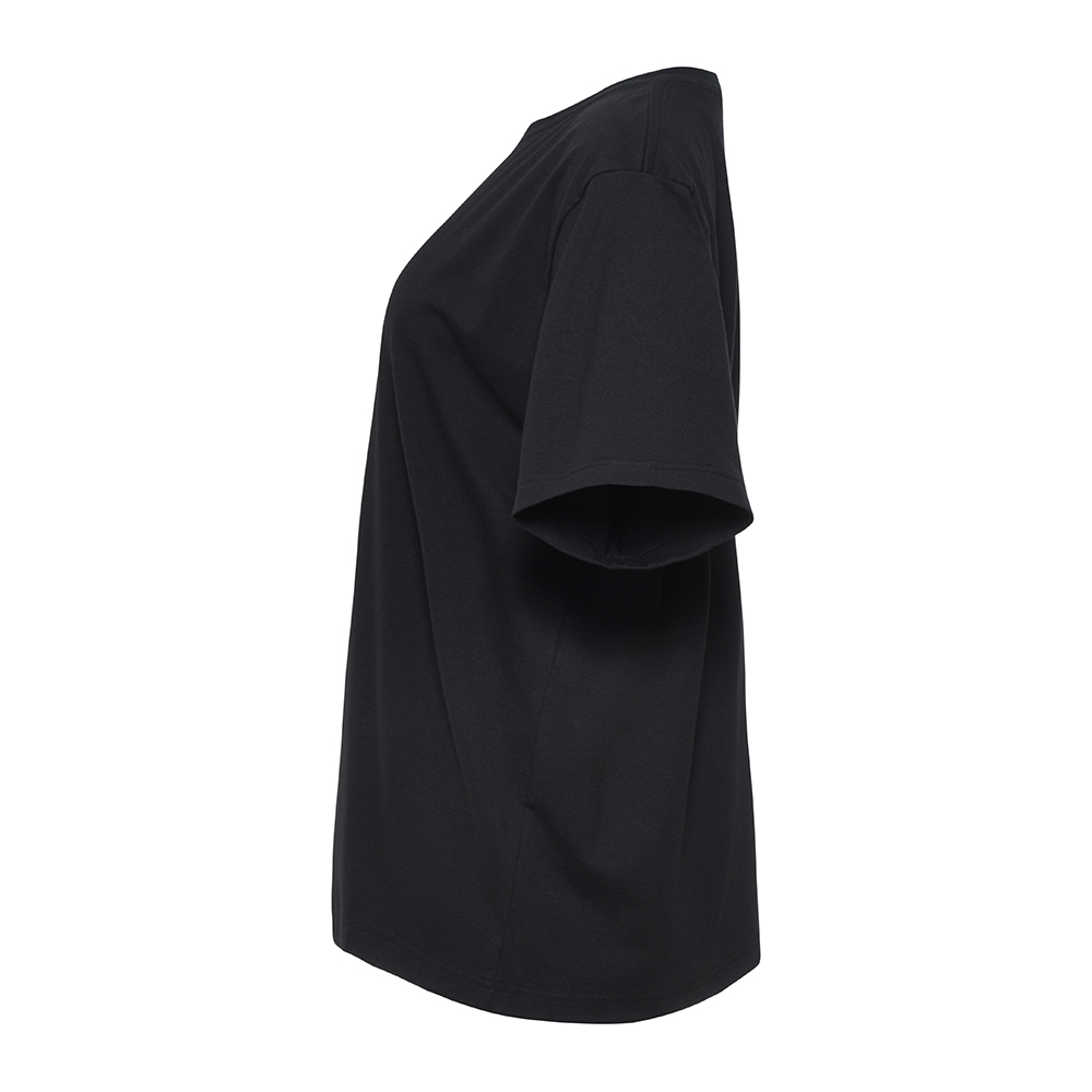 Свободная посадка — прямой фасон, редкий для женской футболки, увеличенные параметры по табелю мер, спущенное плечо и расширенная горловина.