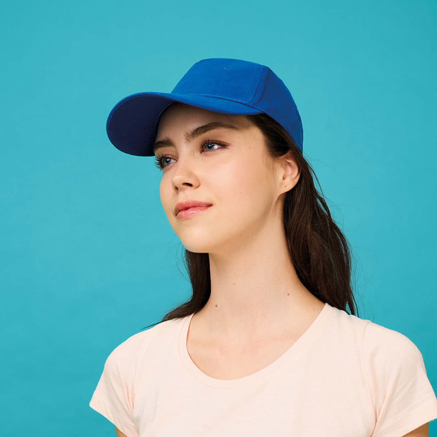 Бейсболка без шва на лбу, 5 клиньев, 4 вышитых люверса, двухцветный жесткий козырек "сэндвич", застежка-липучка.
