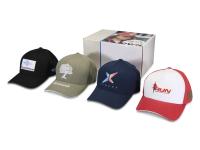 Коробка с образцами 4 бейсболок разных стилей: 1 Boston бейсболка из переработанного хлопка с 5 панелями, 1 Houston бейсболка из переработанного хлопка с 6 панелями, 1 Arizona бейсболка из переработанного хлопка с 5 панелями и многослойным козырьком и 1 Richmond Aware™ бейсболка из переработанного хлопка с 6 панелями и многослойным козырьком. Картон.