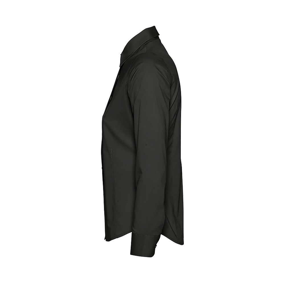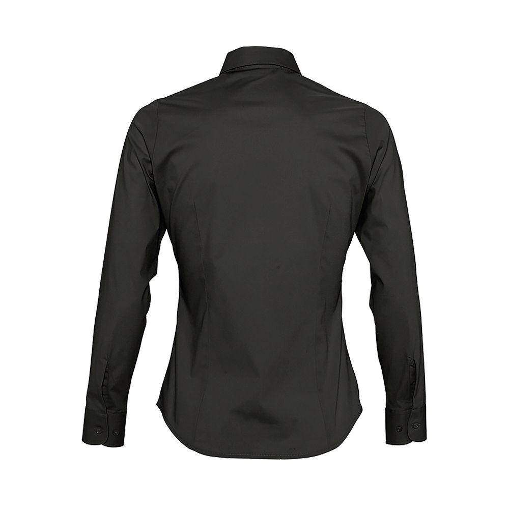Рубашка приталенного кроя с воротником на одной пуговице. Планка на 7 пуговиц в тон, манжеты на 2 пуговицах, вытачки спереди и на спинке.
