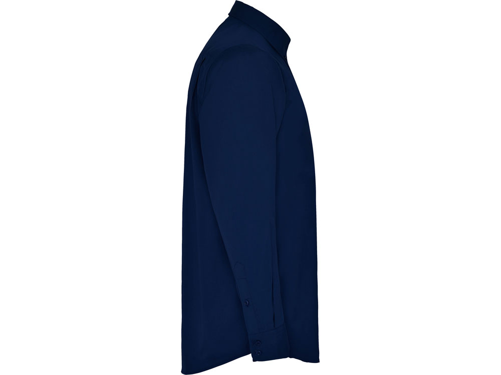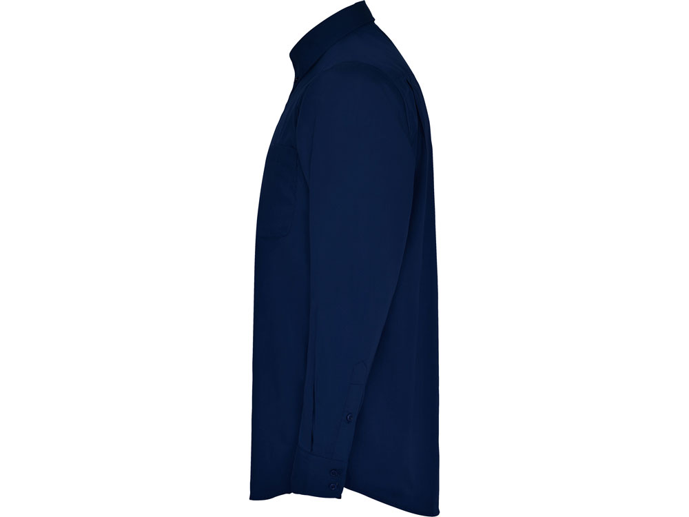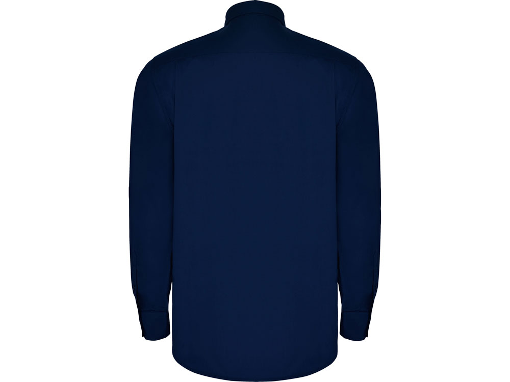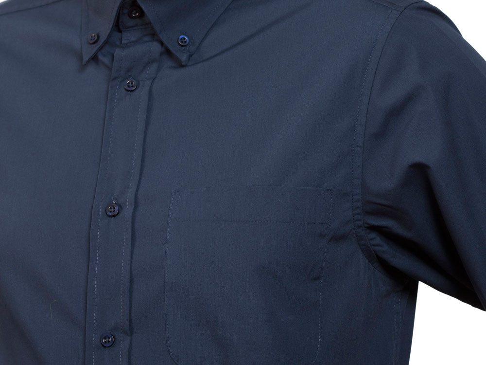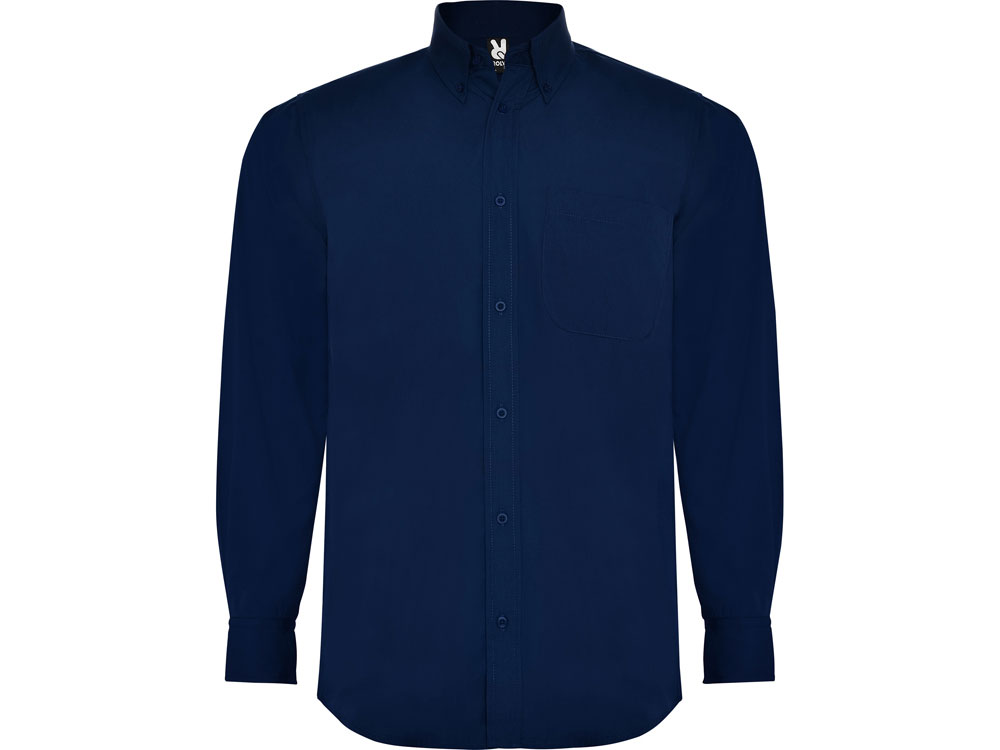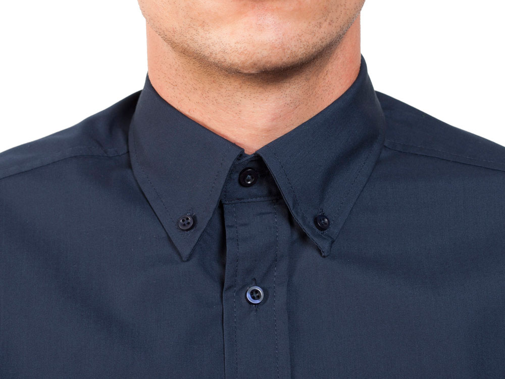 Рубашка мужская с длинным рукавом на семи пуговицах. Накладной карман на груди слева, закругленный низ изделия. Уголки воротника продублированы пуговицами.