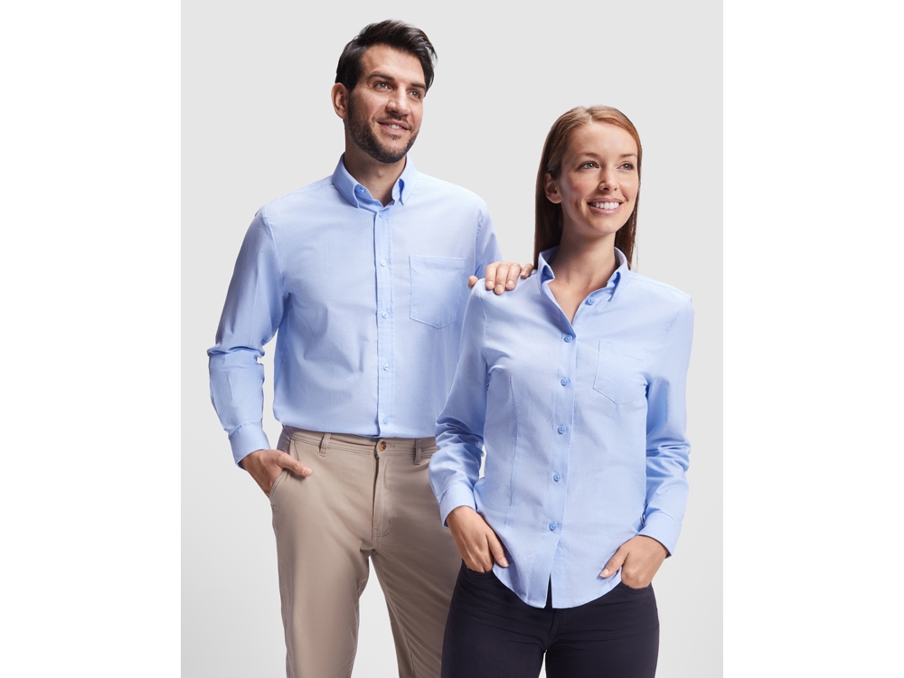 Женская рубашка с длинным рукавом, накладной карман слева. Планка на пуговицах. Отложной воротник на стойке, могут встречаться изделия, где воротник продублирован пуговицами. Манжета регулируется по ширине с помощью 2-х пуговиц. Кокетка на спинке.