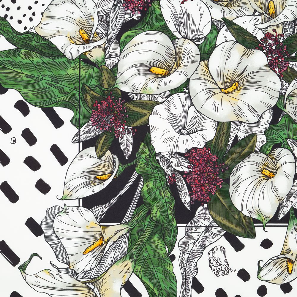 Шелковый платок с цветочным принтом открывает простор для фантазии — его можно использовать как шарф, головной убор или декоративный элемент для верхней одежды и аксессуаров.