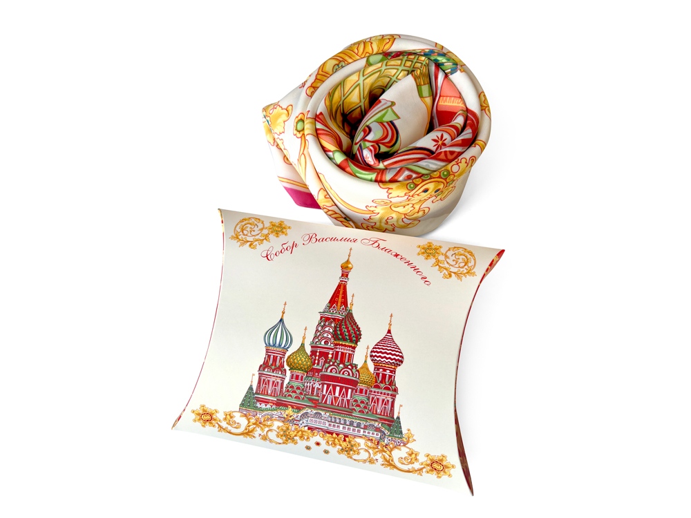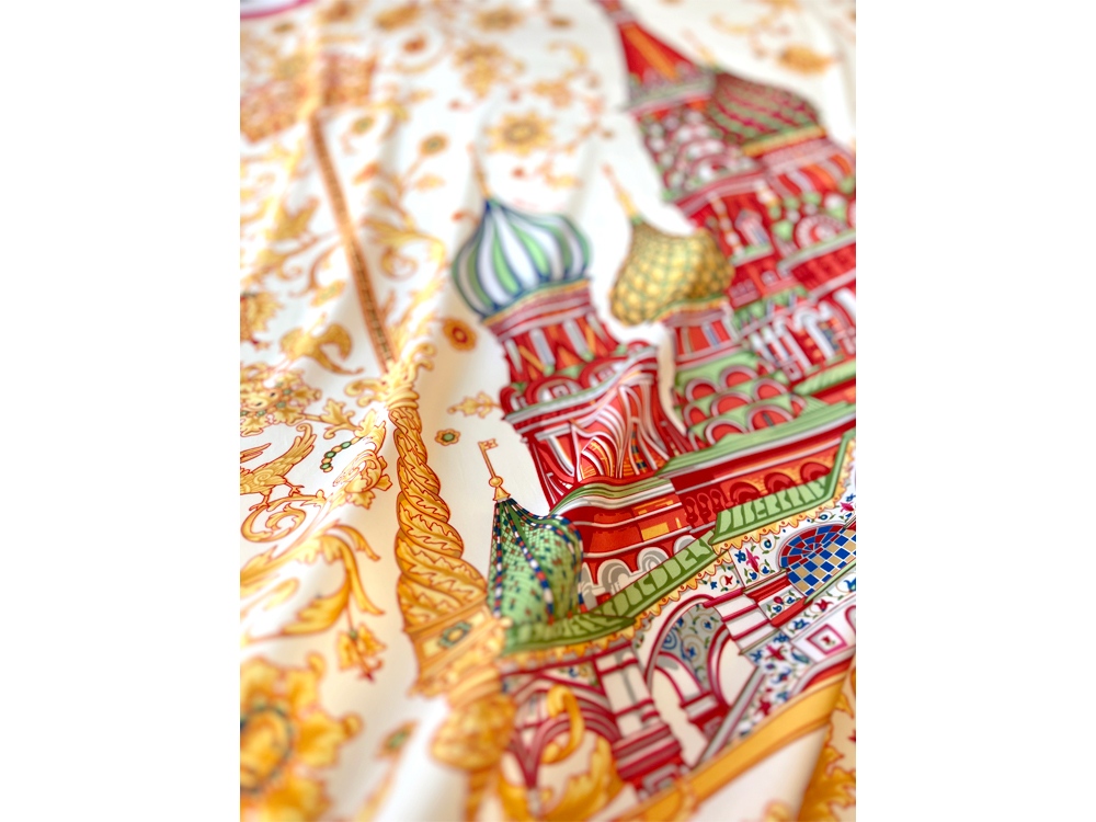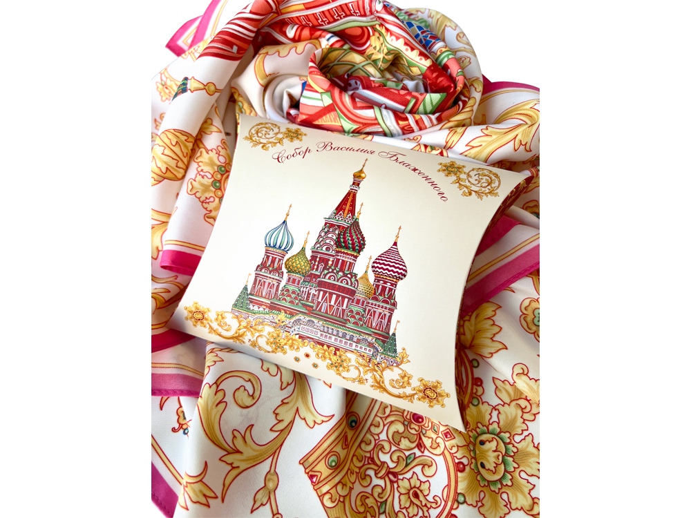 Сказочный вид собора отражен на золотом фоне новинки от бренда Русские в моде by Nina Ruchkina. Настоящее восьмое чудо Света обрамлено царскими коронами и райскими птицами, свидетельствующими об уникальности и роскоши этой исторической достопримечательности, отстроенной 1 октября 1552 года на праздник Покрова Богородицы.