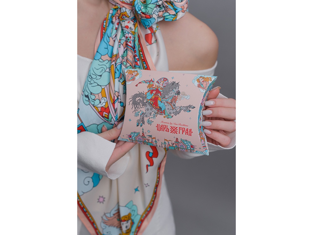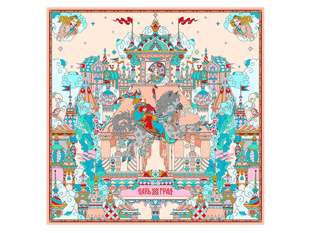 Платок Царьград создан в партнерстве с одноименным загородным курортом, где чтут лучшие обычаи русского гостеприимства. Дизайн платка обращен к воплощению народной традиции чародейства и сказки. Сюжет иллюстрирует фольклорную сцену из произведения Сивка-Бурка о победе истинного чувства и исполнении желаний.