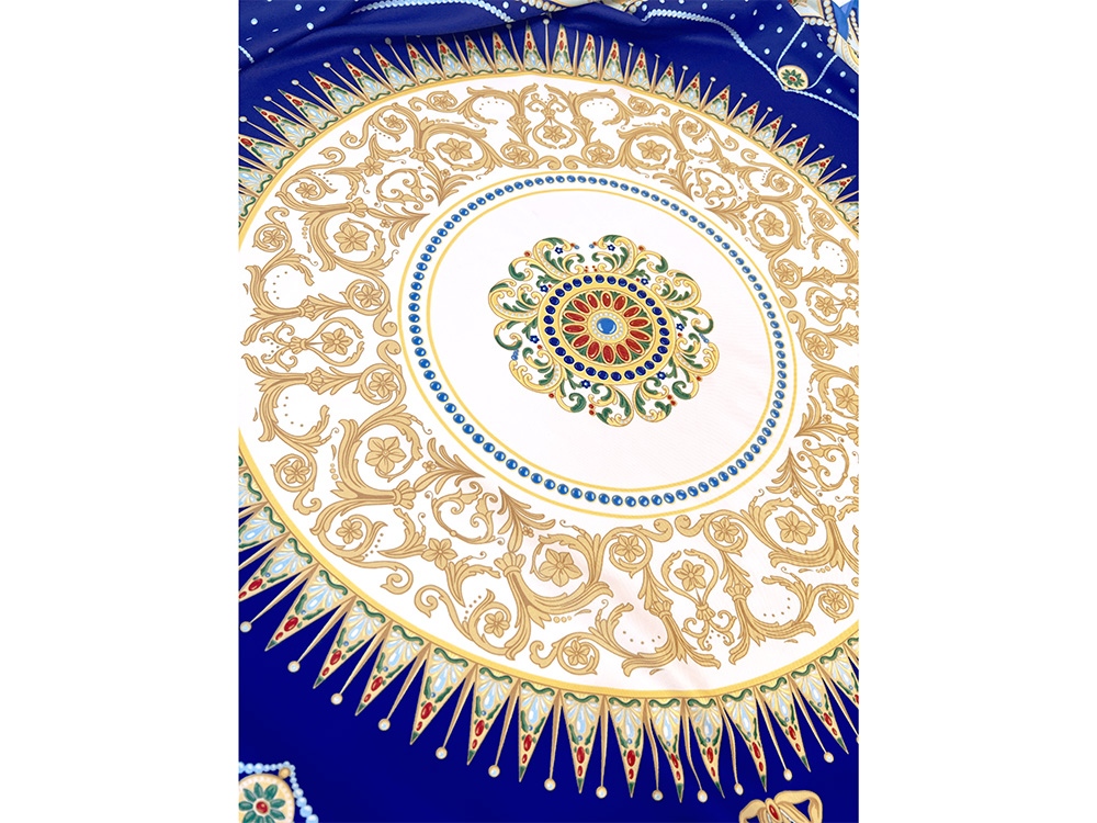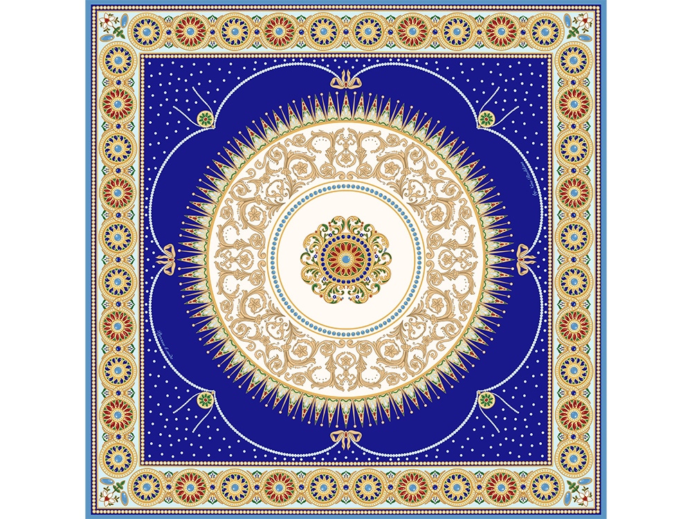 В центре полотна размещен изящный медальон, повторяющий оригинальный рисунок севрского фарфора, выполненного в ювелирной технике накладных эмалей и словно украшенного россыпью драгоценных камней. Цветовой строй воспроизводит парадную эстетику дворцового фарфора, где глубокий королевский синий в сочетании с золочёным орнаментом образуют гармоничное звучание.