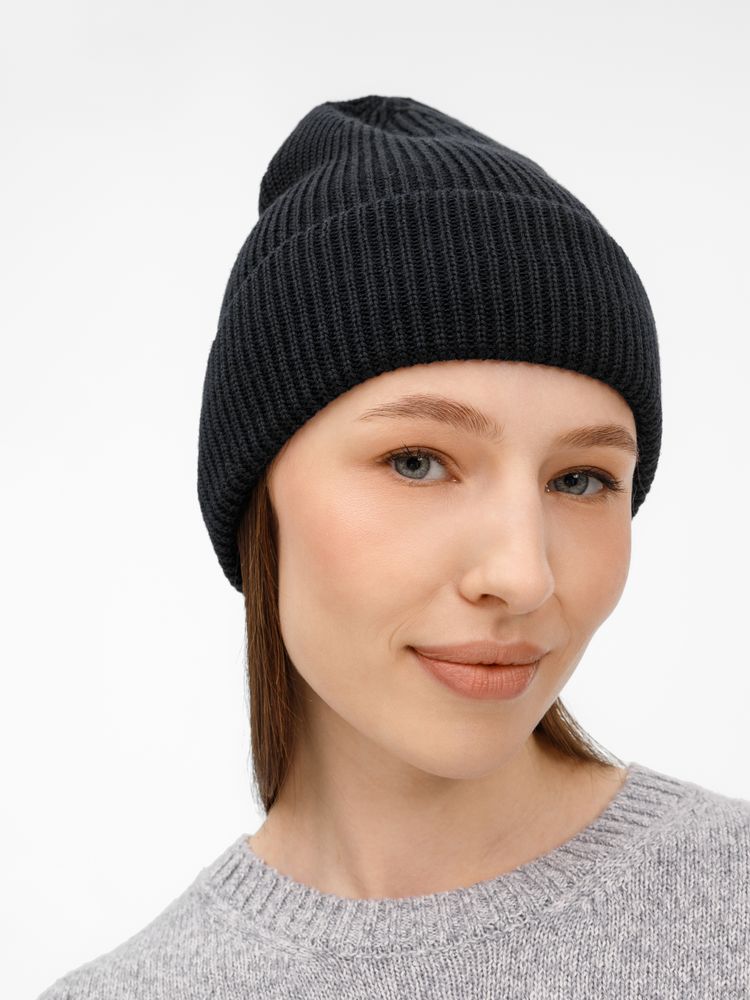 Удлиненный силуэт шапки Nobilis Mono из мягкой полушерстяной пряжи с широким отворотом создает стильный современный образ, а фактурная вязка добавляет объем и выразительность.