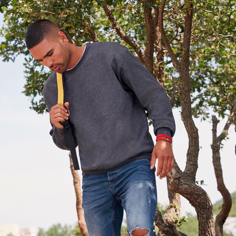 Мужской свитшот с начёсом изнутри. Вырез горловины спинки и плечевые срезы обработаны тесьмой. Низ изделия и манжеты окантованы плотным хлопковым рибом с добавлением лайкры. Двойная укрепляющая строчка по горловине, шву притачивания рукава и низу изделия.