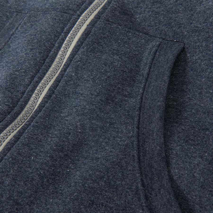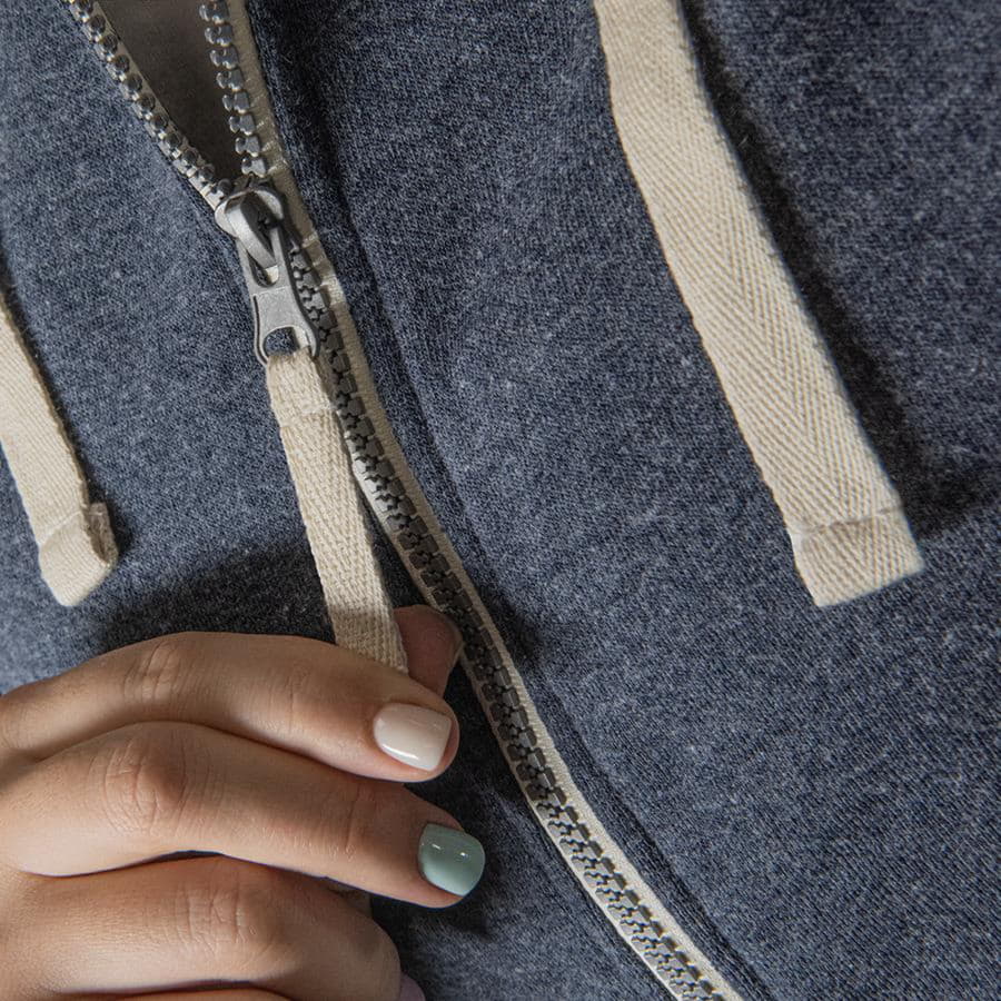 Толстовка с эффектом "меланж". Облегченная пластиковая молния с контрастной тканевой лентой. Капюшон с небольшой стойкой и плоским вытяжным шнуром. Манжеты и низ изделия обработаны рибом 1*1.