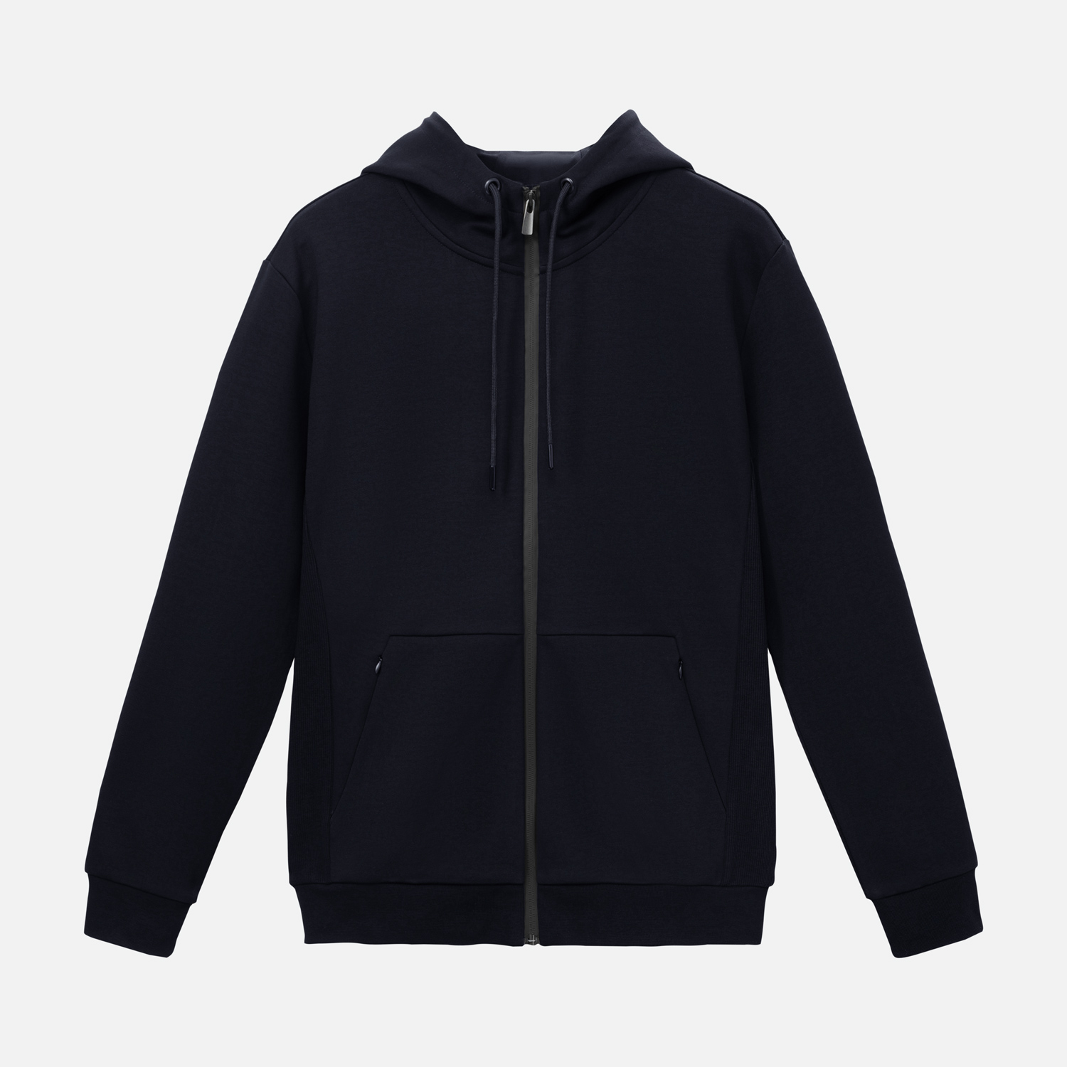 Толстовка сделана из мягкой и прочной ткани интерлок "doubleface", которая приятна к телу и легка в уходе, не растягивается, не выцветает и не деформируется после стирки. Манжеты и низ сделаны из плотной резинки 1х1, благодаря чему вещь держит форму. Карманы на потайных молниях придают толстовке аккуратный вид. Капюшон на подкладке в тон регулируется шнурками.