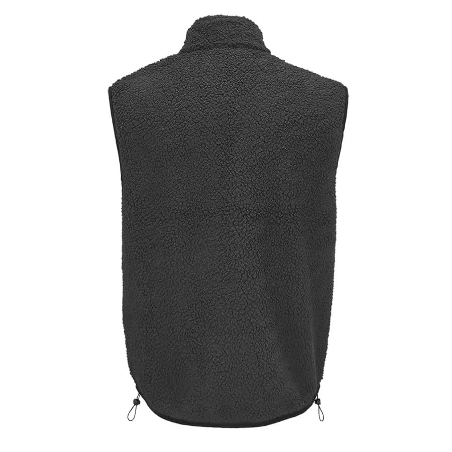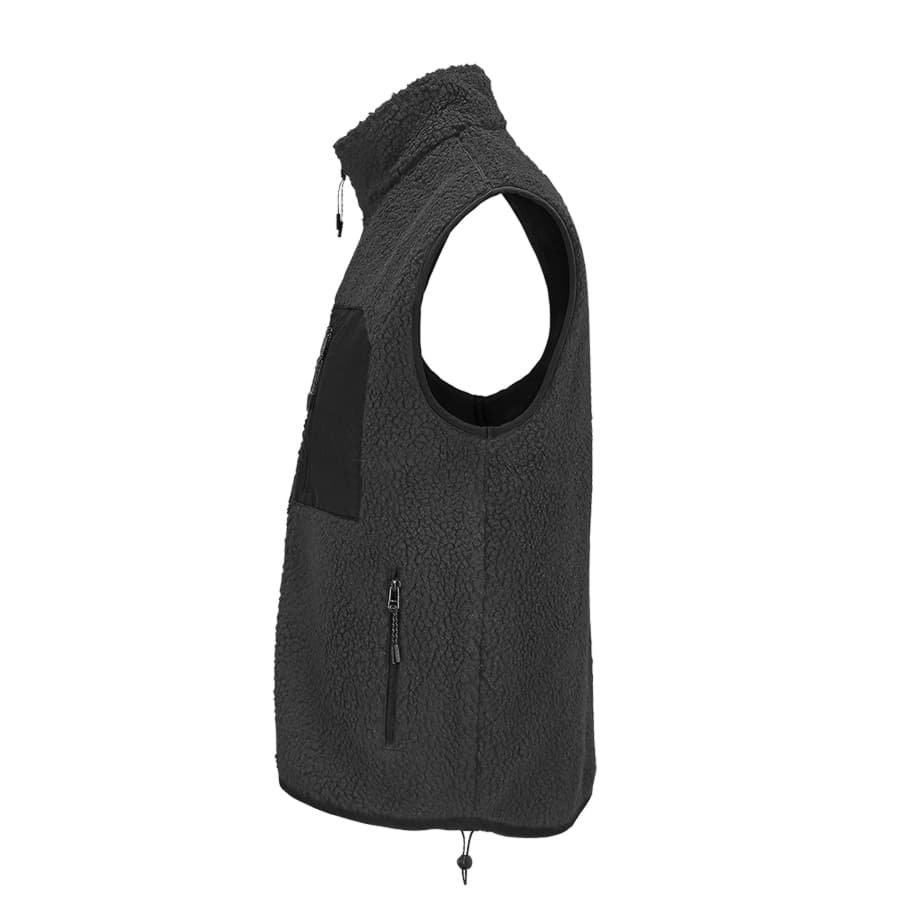 Жилет унисекс из искусственного меха шерпа с карманами на молнии: 1 нагрудным из таслана для нанесения логотипа и 2 боковыми. Черные пуллеры на молниях со светоотражающими элементами.