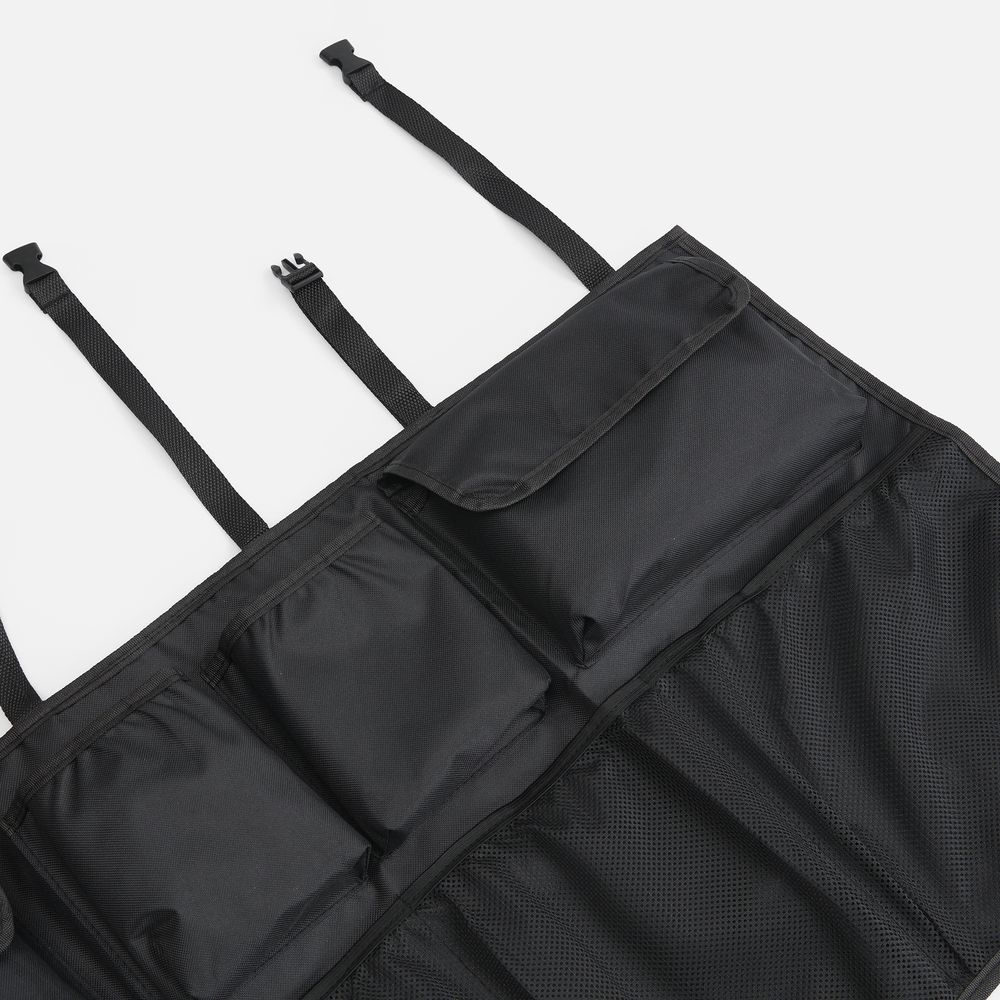 В органайзере имеются разные по форме и типу карманы: карманы-сетки, карманы с крышкой на липучке и открытые карманы. Конструкция крепится ремнями за подголовники задних сидений. Дополнительно на его задней части имеются ленты-липучки, которые обеспечивают полное прилегание к спинкам задних кресел.