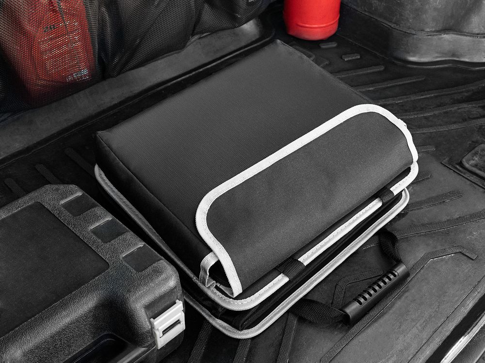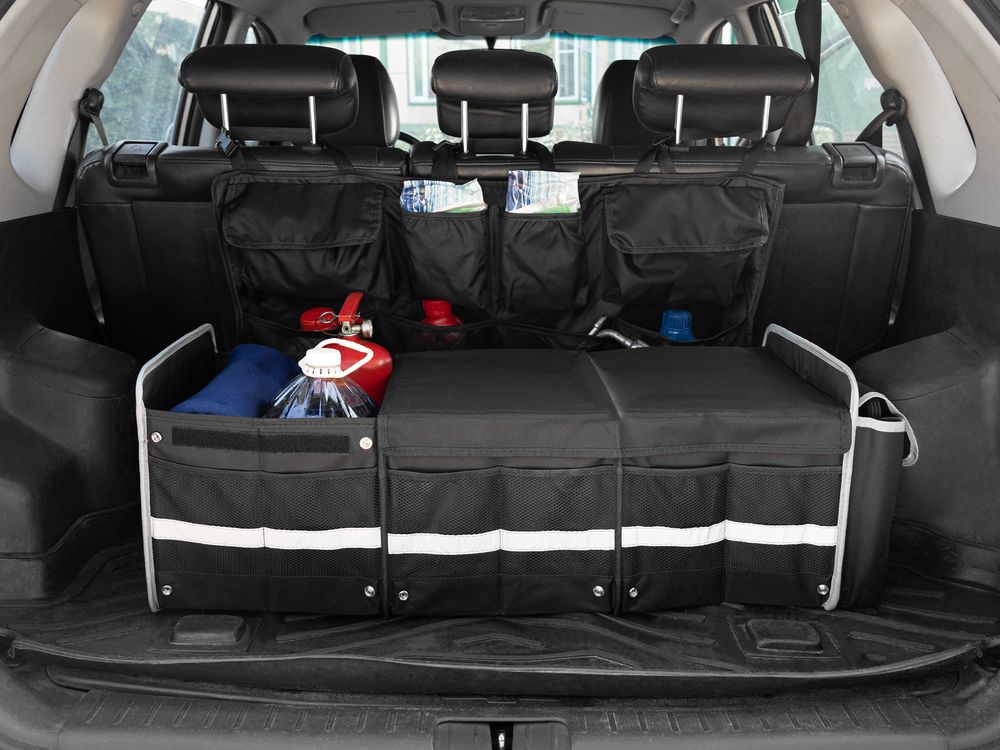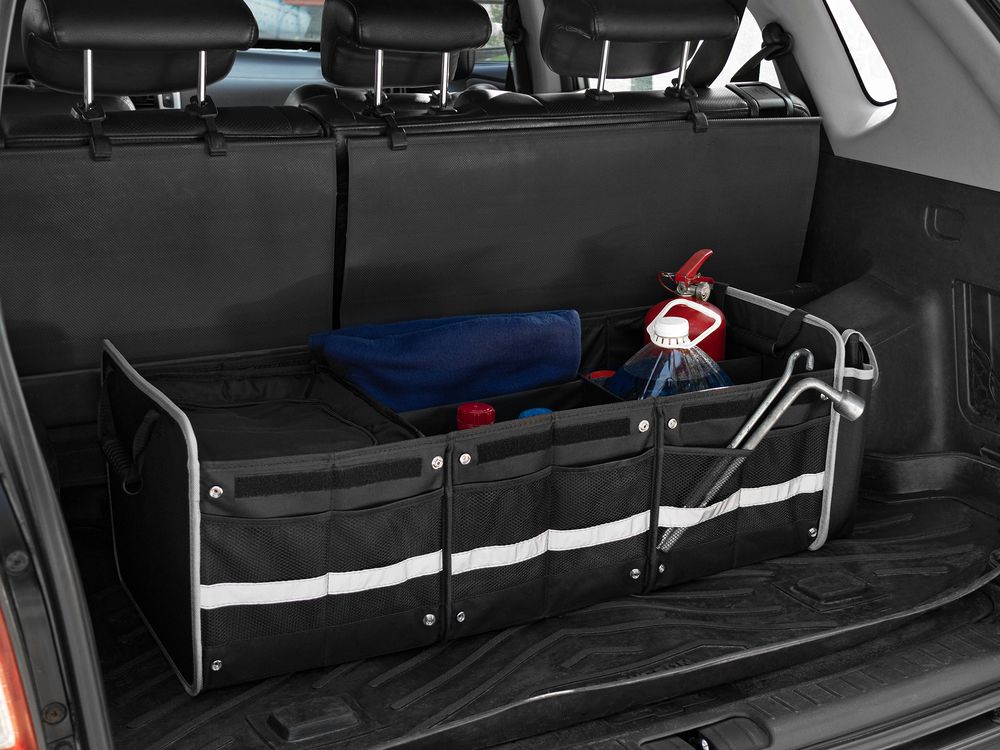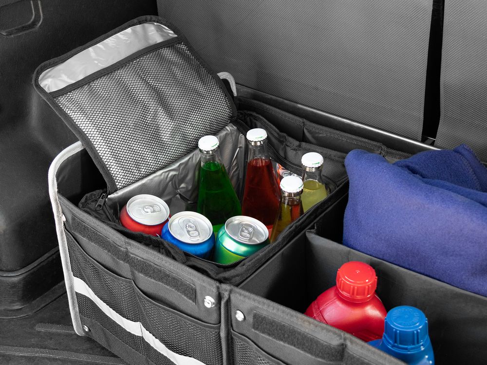 Органайзер состоит из трех основных отсеков, бокового кармана с клапаном и фронтальных карманов из сетки, что позволяет удобно хранить самые разные предметы: бутылки, сумки, инструменты, продукты и аксессуары. Также в комплект входит сумка-холодильник с водонепроницаемой подкладкой, которую можно вставить в одно из отделений, использовать отдельно, а когда она не нужна, сложить и убрать в боковой карман органайзера.