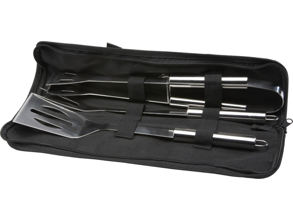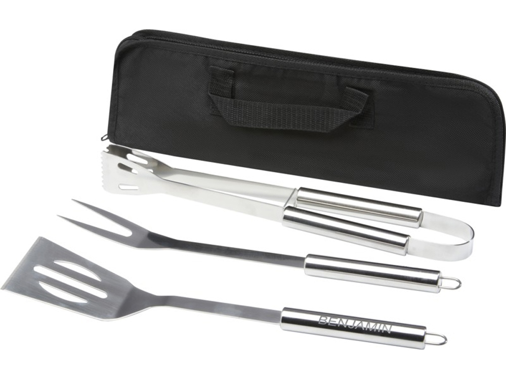 Набор для барбекю из 3 предметов: лопатка (34,8 x 7,5 см), вилка (35,4 x 3,35 см) и щипцы (35 x 6,8 x 4 см). Все аксессуары поставляются в легком футляре для удобства переноски и хранения. Идеальный аксессуар для барбекю в саду или для того, чтобы взять с собой для приготовления еды на гриле на открытом воздухе с друзьями и семьей.