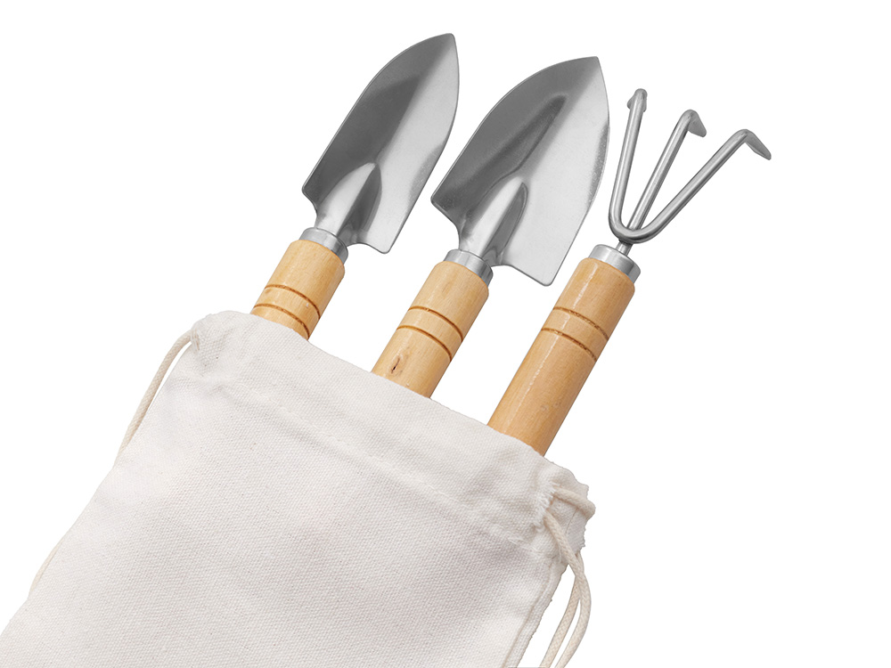 Садовый набор из 3 аксессуаров из нержавеющей стали и бамбуковая ручка. Включает большую и малую лопатки и грабли. В комплект входит хлопковый чехол. Презентация в дизайнерской эко-коробке.
