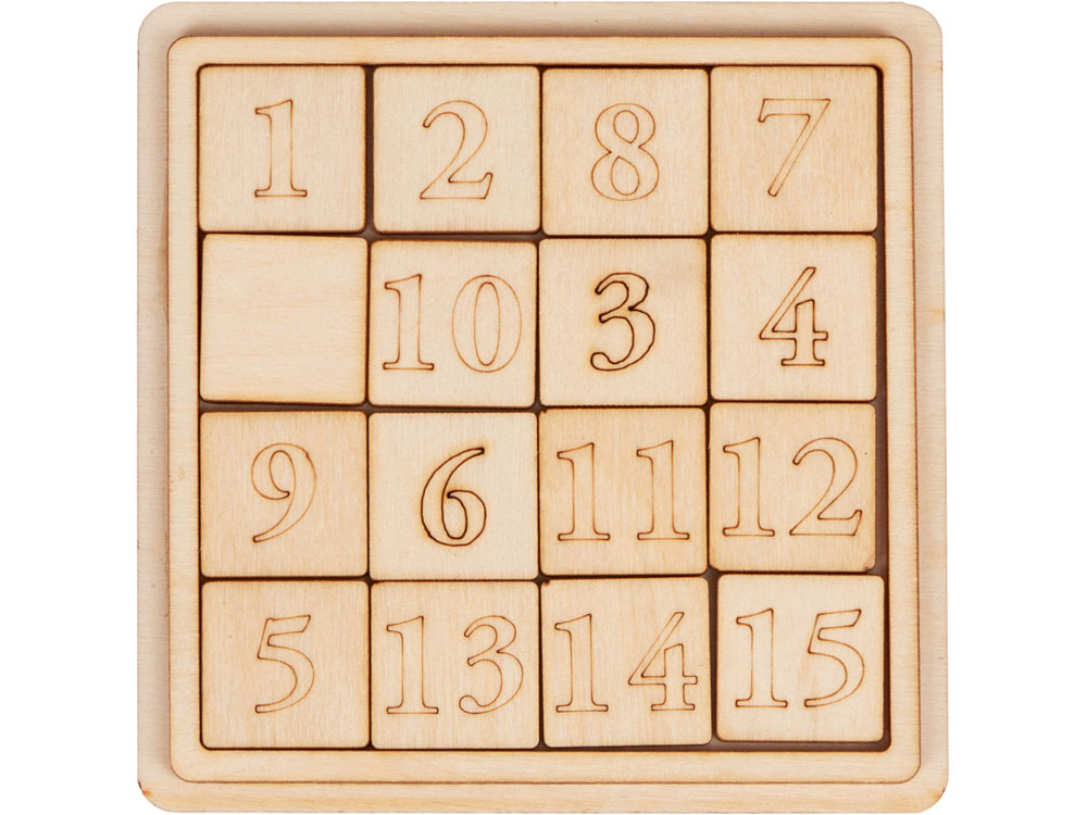 Задача игрока - выставить все цифры в правильном порядке от 1 до 15. Поле из берёзовой фанеры вмещает в себя 15 квадратов с цифрами и одно пустое место для перемещения цифр.