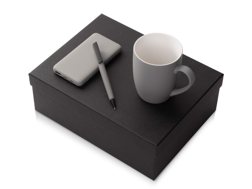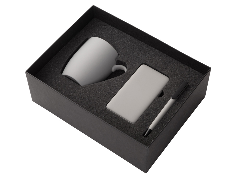 кружка - фарфор с покрытием soft-touch, повербанк - пластик с покрытием soft-touch, ручка - пластик с покрытием soft-touch.