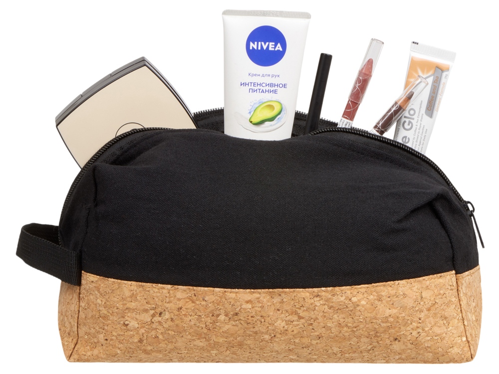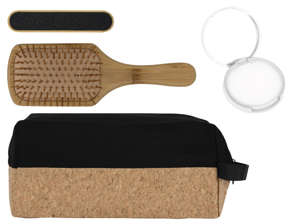 расческа, пилка для ногтей - бамбук, бальзам для губ -пластик, несессер - хлопок, пробка, ручка - полиэстер