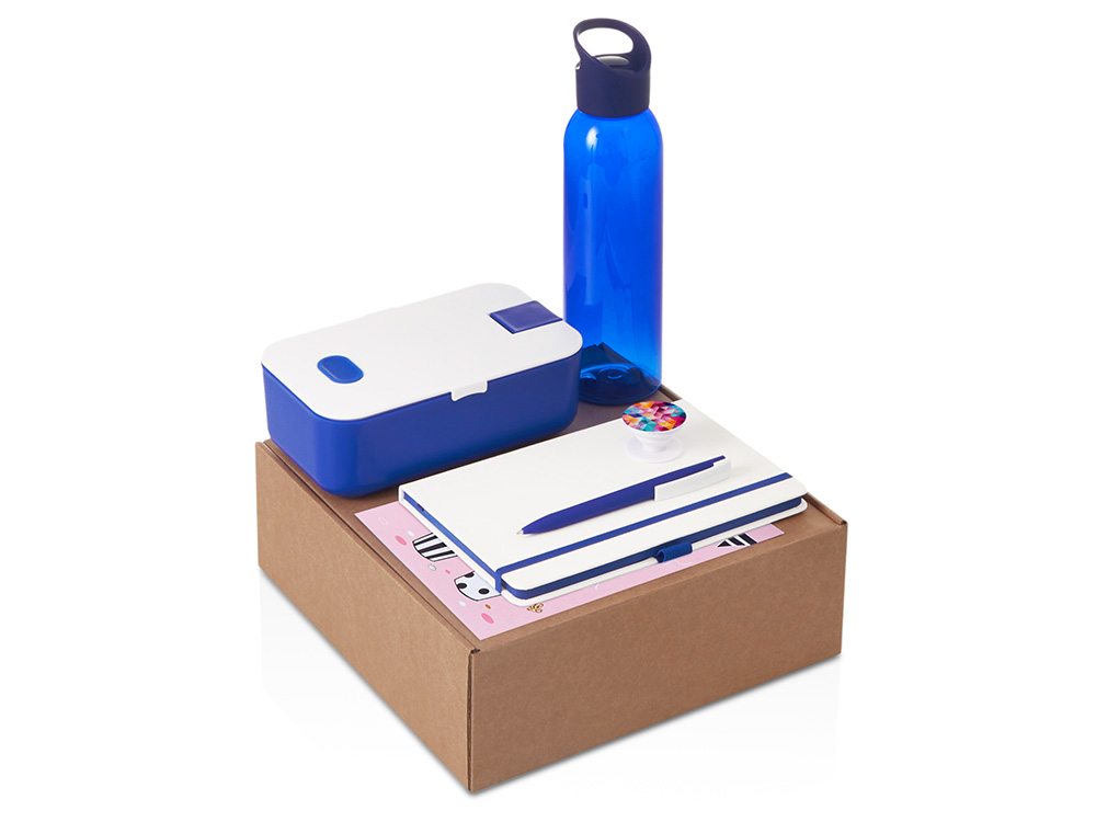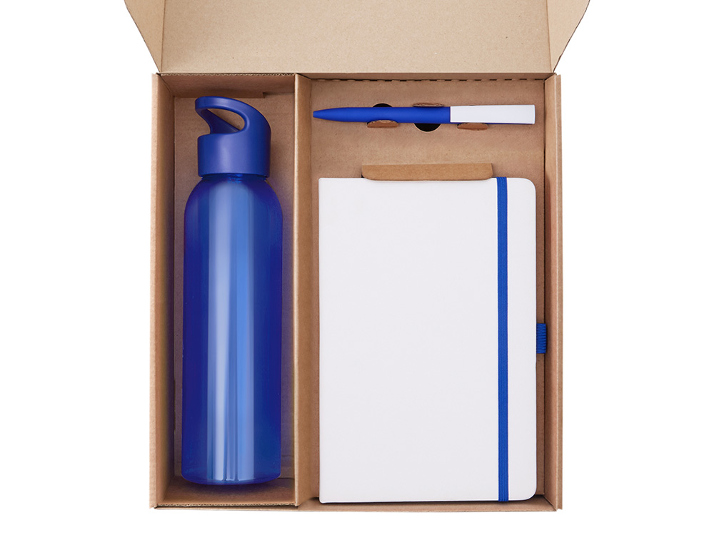 бутылка -поликарбонат, блокнот - искусственная кожа, бумага, ручка - пластик с покрытием soft-touch, держатель - пластик, ланчбокс - пластик, открытка - картон, коробка - картон