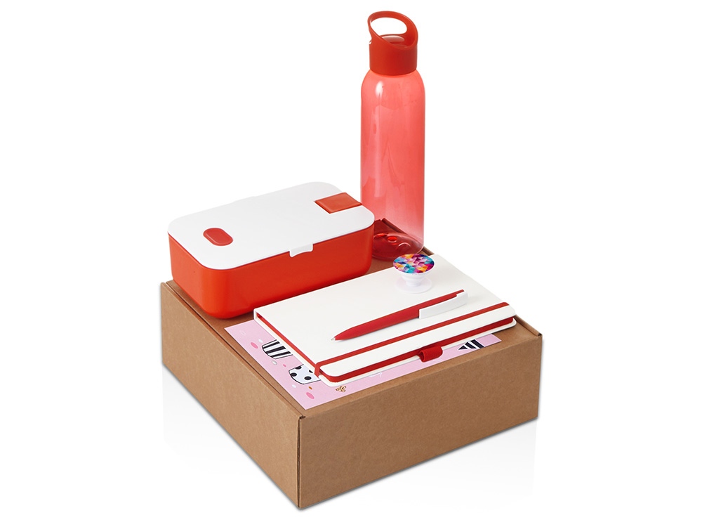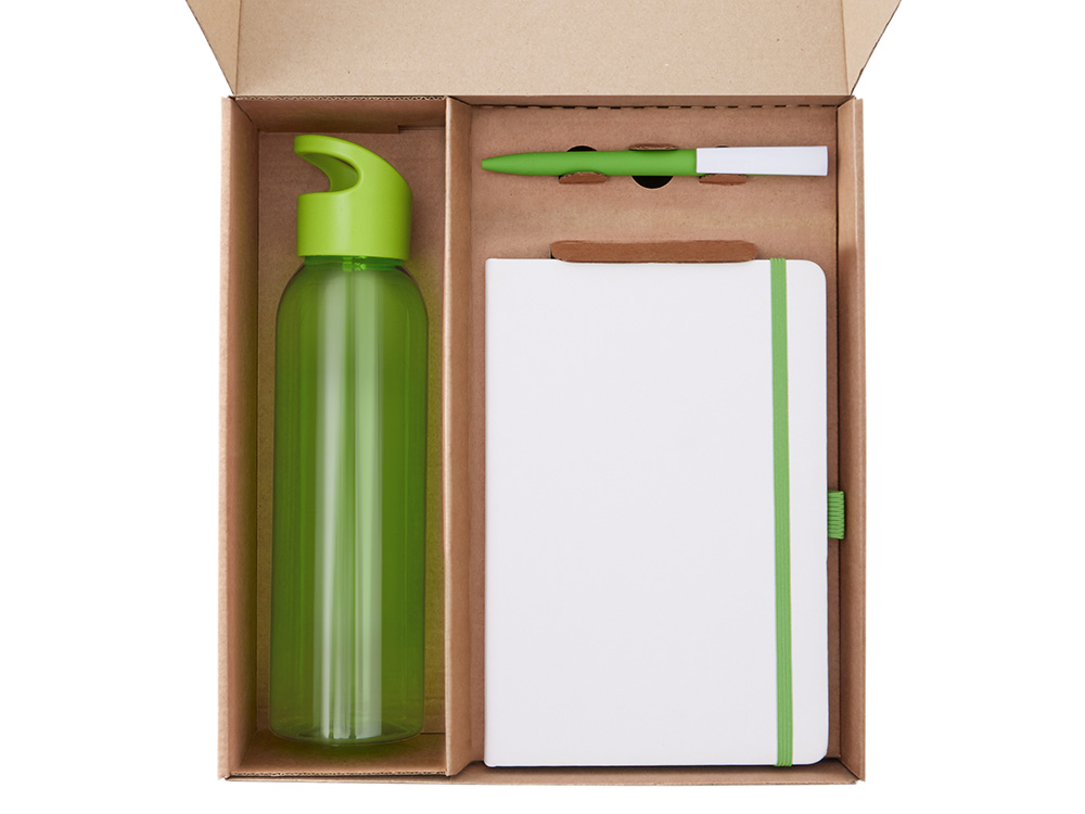 бутылка -поликарбонат, блокнот - искусственная кожа, бумага, ручка - пластик с покрытием soft-touch, держатель - пластик, ланчбокс - пластик, открытка - картон, коробка - картон