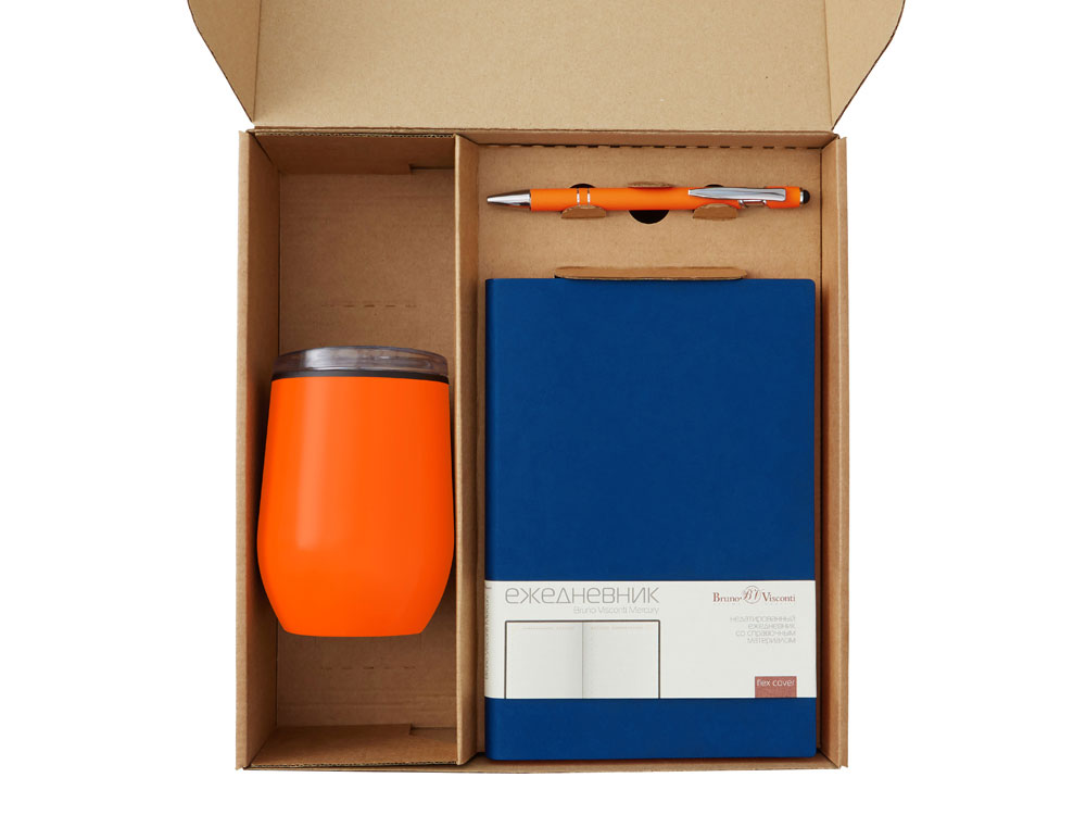 ежедневник - искусственная кожа, термокружка - нержавеющая сталь снаружи, полипропилен внутри, ручка - металл c покрытием soft-touch, ситечко - нержавеющая cталь