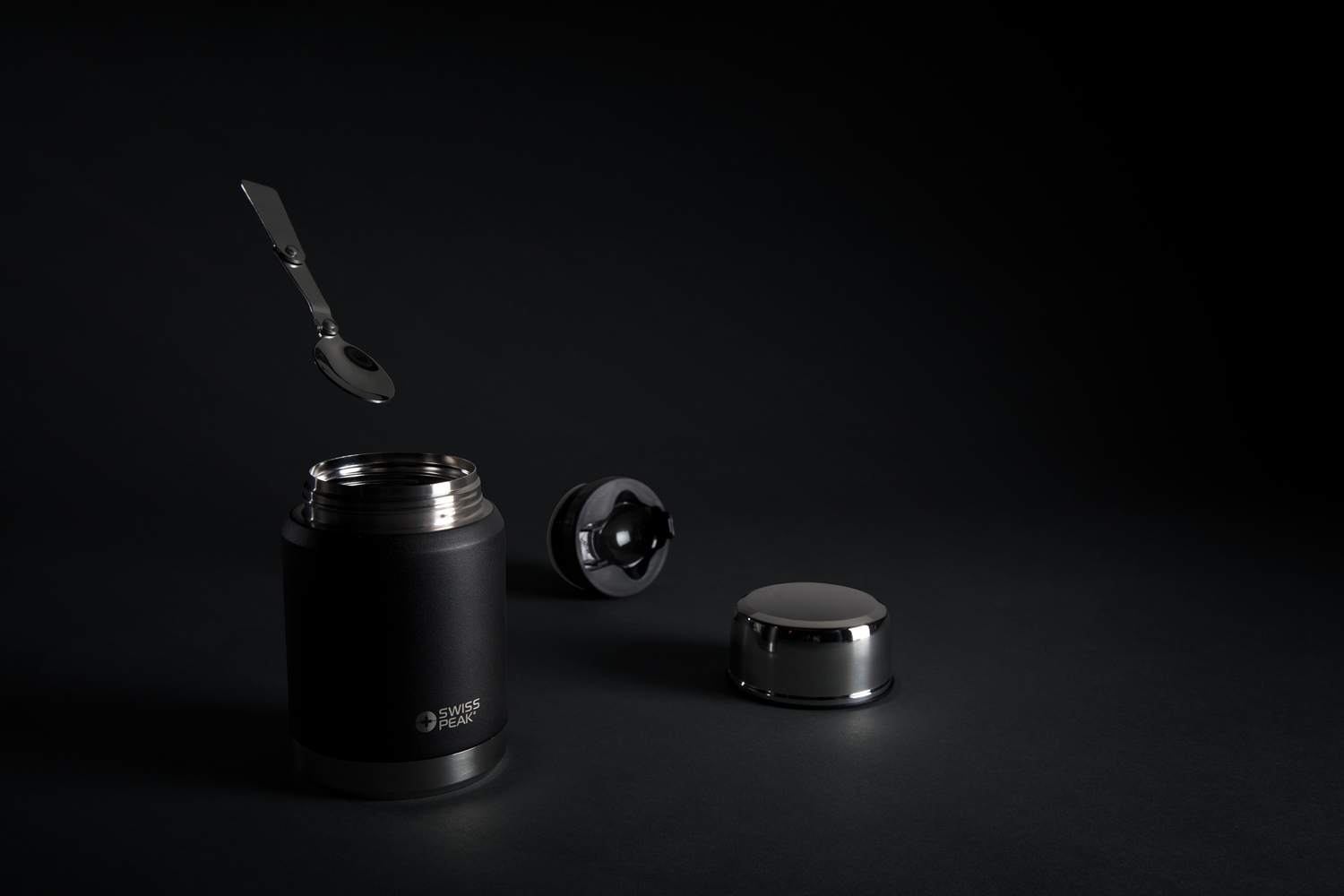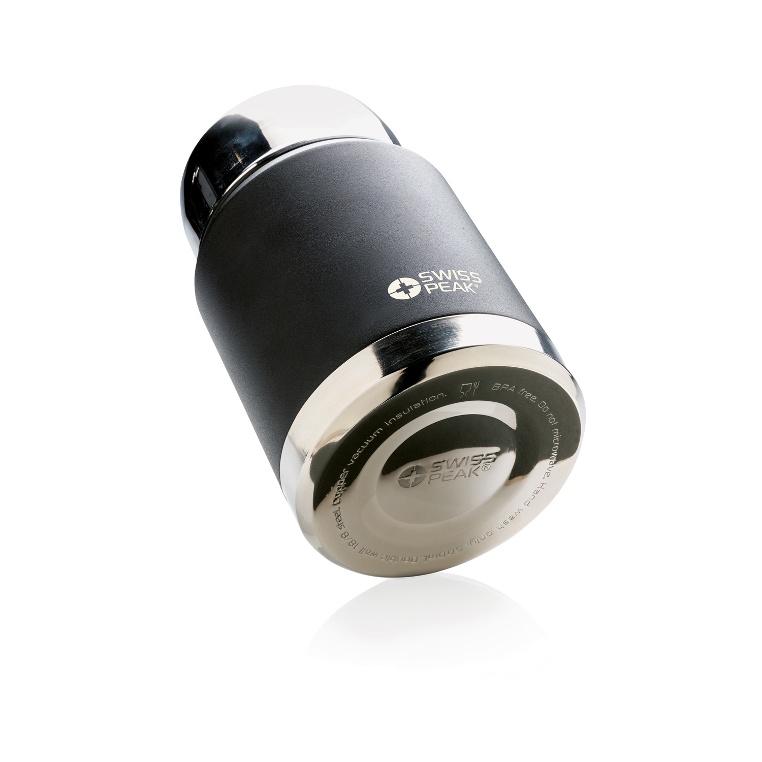 Коллекция Swiss Peak Elite с вакуумной изоляцией и двойными стенками из нержавеющей стали 18/8. Долговечное внешнее покрытие черного цвета, которое не облезет и не потрескается. Внутренние стенки покрыты медью, что обеспечивает максимальную проводимость для того, чтобы напитки сохраняли тепло до 8 часов или оставались холодными до 24 часов. Этот контейнер для еды сохранит вашу еду горячей или холодной в течение целого дня! В комплекте ложка из нержавеющей стали 18/8. Только ручная мойка. С защитой от протекания. Объем 500мл.