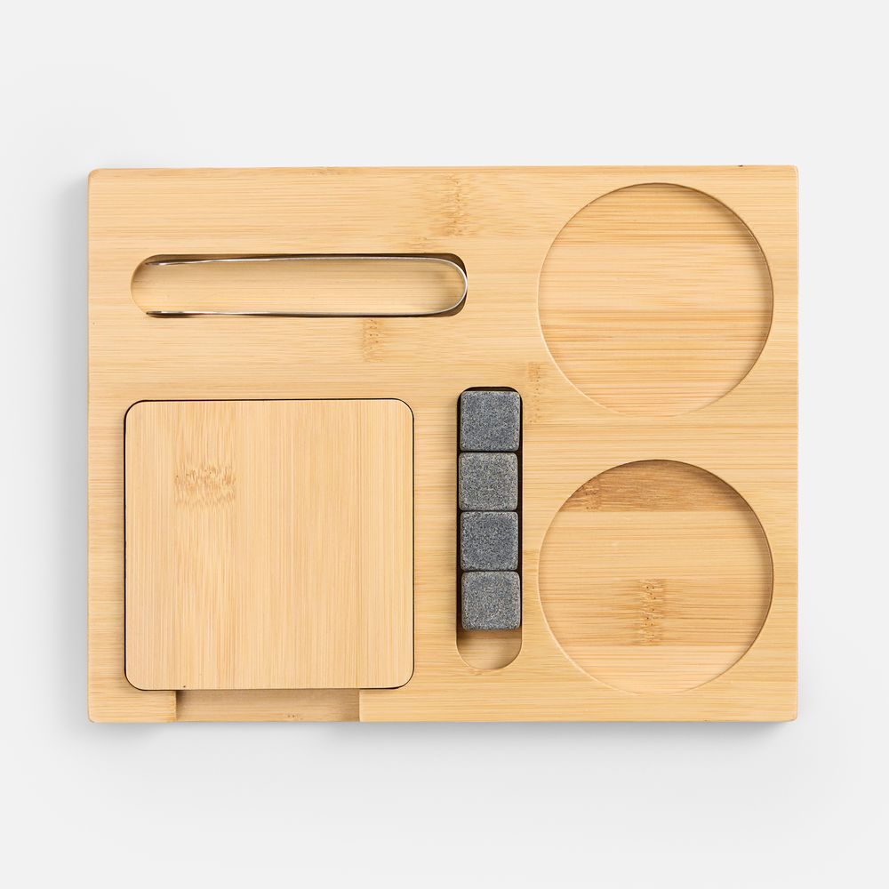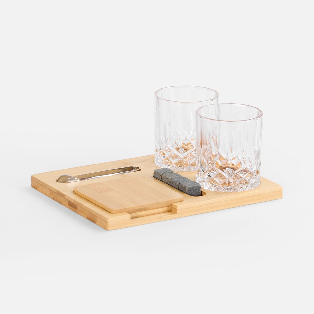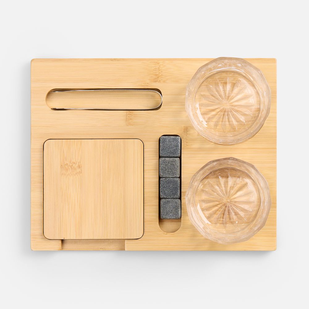 Полный арсенал для дегустации любимых сортов виски включает два элегантных стакана, костеры и доску из натурального бамбука для безупречной подачи, камни для охлаждения напитка без потери глубины вкуса и удобные щипцы для их использования.
