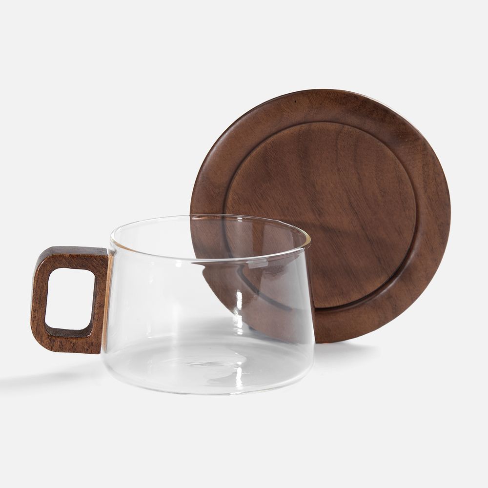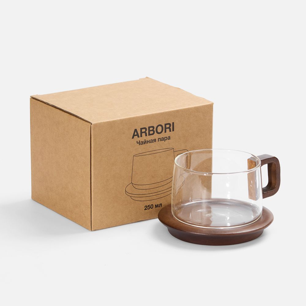 Чайная пара Arbori с чашкой из прочного боросиликатного стекла в сочетании с элементами из ореха станет изюминкой домашней или офисной подачи горячих напитков.