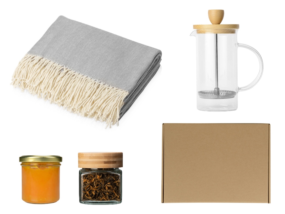 плед - 100% хлопок, чай - банка -стекло, крышка- дерево, френч-пресс - боросиликатное стекло, буковое дерево, нержавеющая сталь 304 марки, коробка - картон
